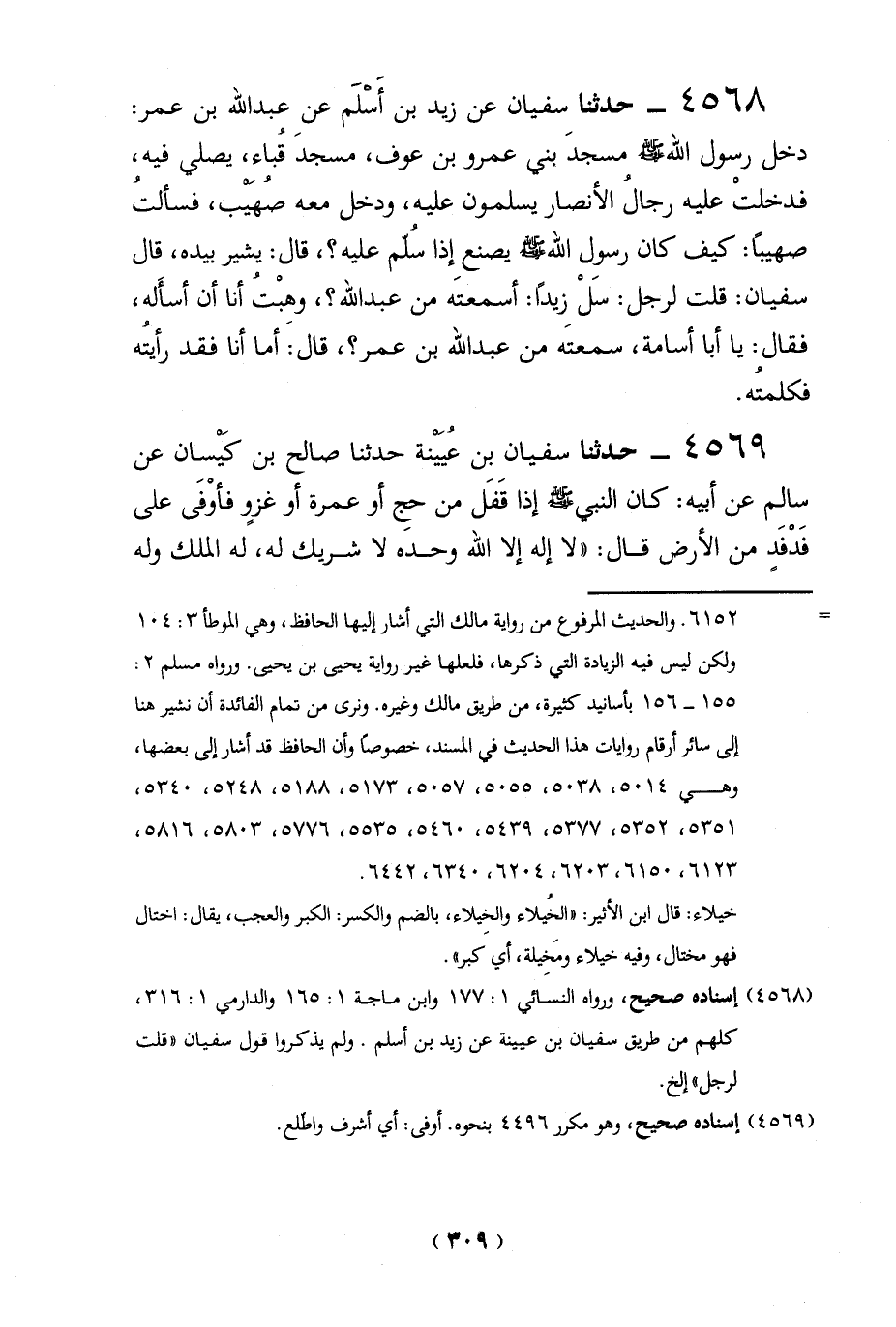 4568 - حدثنا سفيان عن زيد بن أَسْلَم عن عبد الله بن عمر: دخل رسول الله - صلى الله عليه وسلم - مسجدَ بني عمرو بن عوف، مسجدَ قُباء يصلي فيه، فدخلتْ عليه رجالُ الأنصار يسلمون عليه، ودخل معه صُهَيْب، فسألتُ صهيباً: كيف كان رسول الله - صلى الله عليه وسلم - يصنع إذا سُلّم عليه؟، قال: يشير بيده، قال سفيان: قلت لرجل: سَلْ زِيداً: أسمعتَه من عبد الله؟، وهبْتُ أنا أن أسأَله، فقال: يا أبا أسامة، سمعته من عبد الله بن عمر؟، قال: أما أنا فقد رأيتُه فكلمتُه.