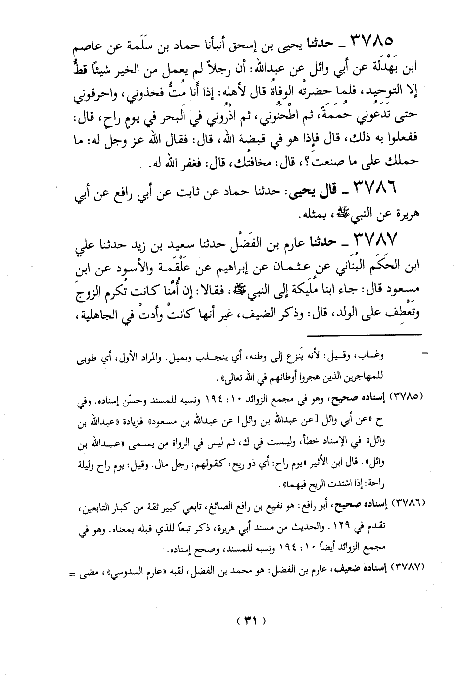 3787 - حدثنا عارم بن الفَضْل حدثنا سعيد بن زيد حدثنا علي ابن الحَكَم البُنَاني عن عثمان عن إبراهيم عن عَلْقَمة والأسود عن ابنِ مسعود قال: جاء ابنا مُلَيكة إلى النبي - صلى الله عليه وسلم -، فقالا: إن أُمنا كانت تكرم الزوج وتَعْطِف على الولد، قال: وذكر الضيف، غير أنها كانتْ وأدتْ في الجاهلية،