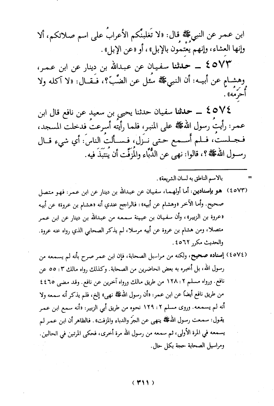 (4573) هو بإسنادين: أما أولهما، سفيان عن عبد الله بن دينار عن ابن عمر: فهو متصل صحيح. وأما الآخر "وهشام عن أبيه": فالراجح عندي أنه "هشام بن عروة" عن أبيه "عروة بن الزبير"، وأن سفيان بن عيينة سمعه من عبد الله بن دينار عن ابن عمر متصلاً، ومن هشام بن عروة عن أبيه مرسلاً، لم يذكر الصحابي الذي رواه عنه عروة.