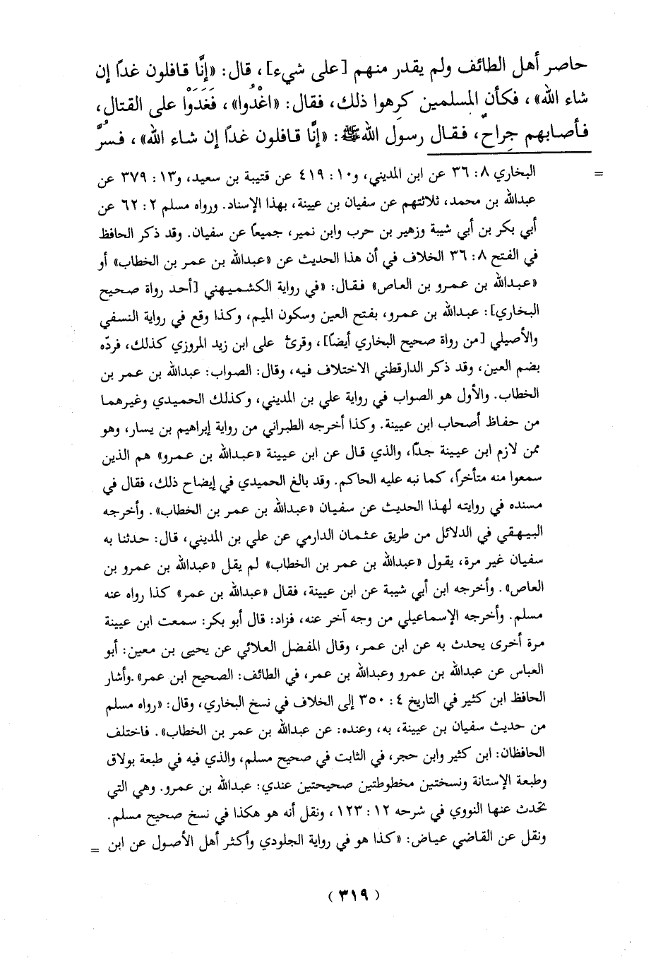 سفيان غير مرة، يقول "عبد الله بن عمر بن الخطاب" لم يقل "عبد الله بن عمرو بن العاص". وأخرجه ابن أبي شيبة عن ابن عيينة، فقال "عبد الله بن عمر" كذا رواه عنه مسلم. وأخرجه الإسماعيلى من وجه آخر عنه، فزاد: قال أبو بكر: سمعت ابن عيينة مرة أخرى يحدث به عن ابن عمر، وقال المفضل العلائى عن يحيى بن معين: أبو العباس عن عبد الله بن عمرو وعبد الله بن عمر، في الطائف: الصحيح ابن عمر". وأشار الحافظ ابن كثير في التاريخ 4: 350 إلى الخلاف في نسخ البخاري، وقال: "رواه مسلم من حديث سفيان بن عيينة، به، وعنده: عن عبد الله بن عمر بن الخطاب". فاختلف الحافظان: ابن كثير وابن حجر، في الثابت في صحيح مسلم، والذي فيه في طبعة بولاق وطبعة الإستانة ونسختين مخطوطتين صحيحتين عندي: عبد الله بن عمرو. وهي التي تحدث عنها النووي في شرحه 12: 123، ونقل أنه هو هكذا في نسخ صحيح مسلم.