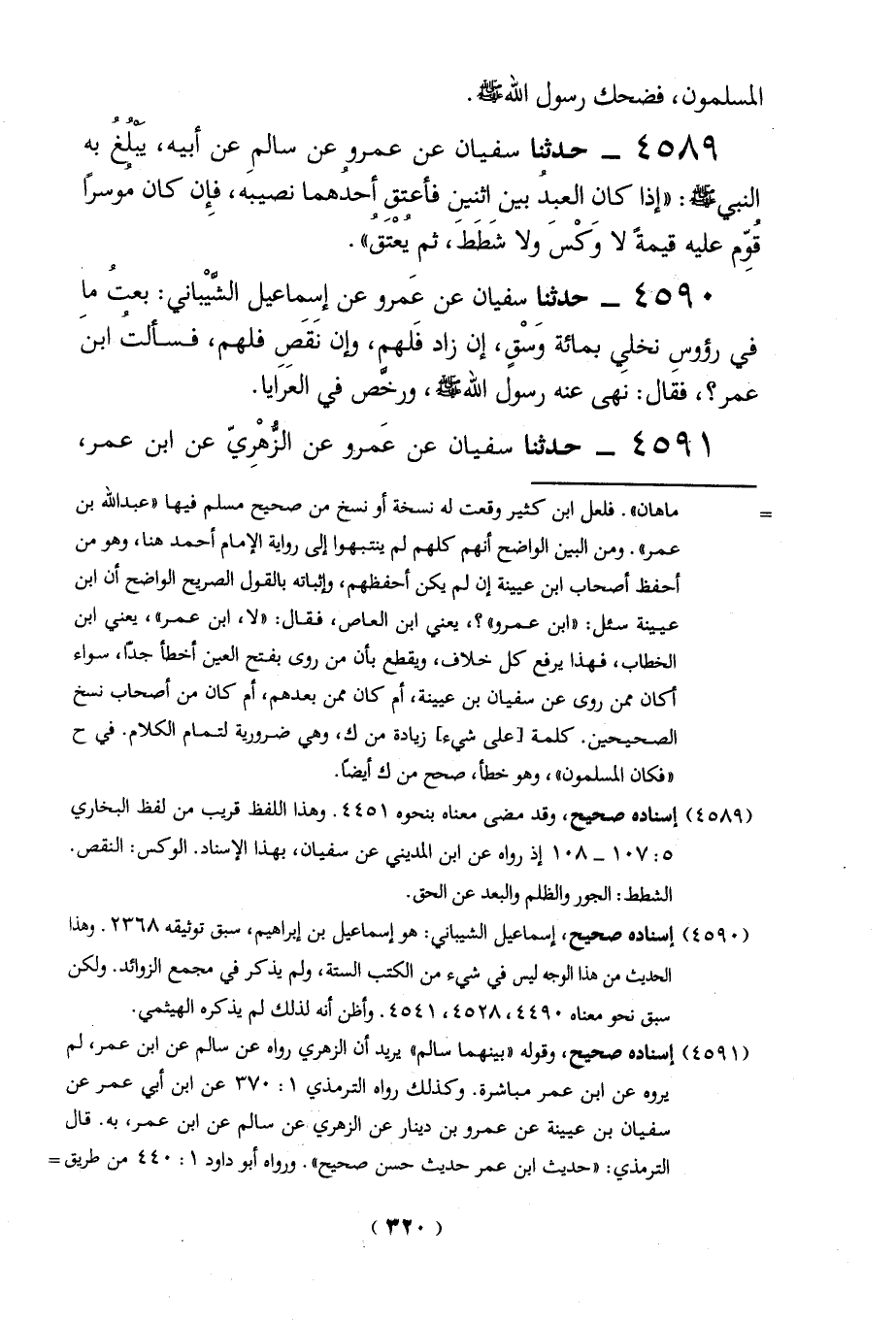4590 - حدثناِ سفيان عن عَمرو عن إسماعيل الشَّيْباني: بعتَ ماْ في رؤوسِ نخلي بمائة وَسْقٍ، إن زاد فَلهم، وإن نَقَص فلهم، فسألتُ ابنَ عمر؟، فقال: نهى عنه رسول الله -صلي الله عليه وسلم-، ورخَّص في العَرَايا.