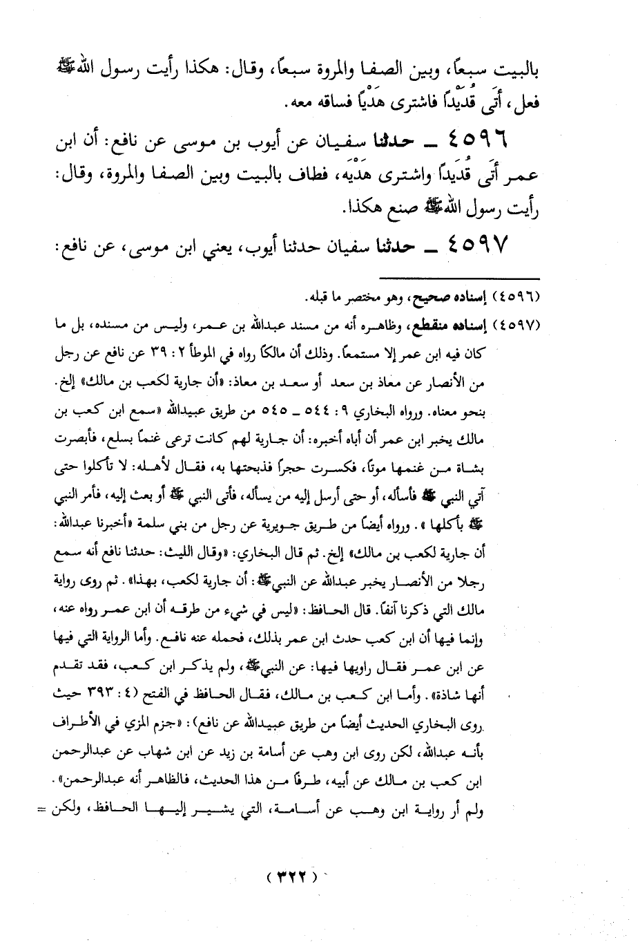 4596 - حدثنا سفيان عن أيوب بن موسى عن نافع: أن ابن عمر أتَى قُدَيداً فاشترى هَدْيَه، فطاف بالبيت وبين الصفا والمروة، وقال: رأيت رسول الله -صلي الله عليه وسلم- صنع هكذا.
