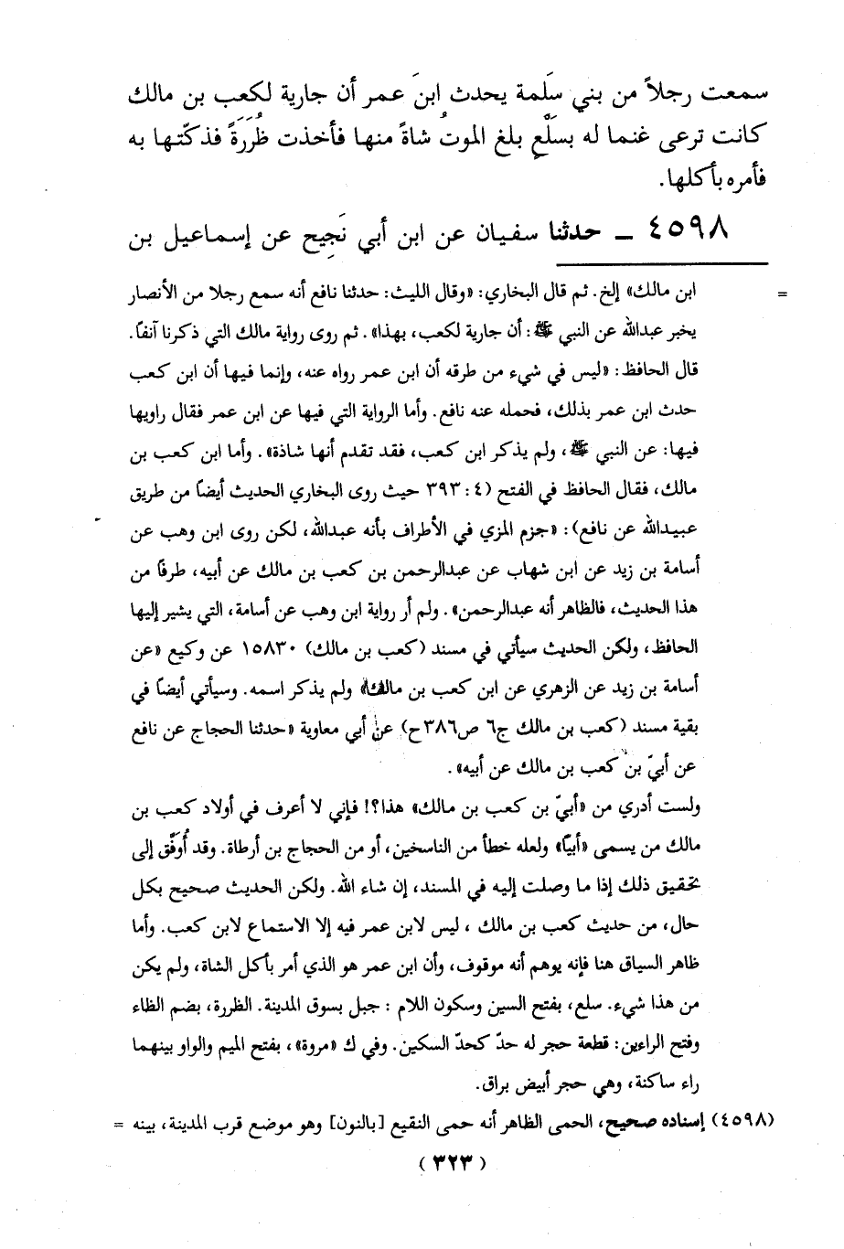 سمعت رجلاً من بني سَلمة يحدث ابنَ عمر أن جارية لكعب بن مالك كانت ترعى غنما له بسَلَّع بلغ الموتُ شاةً منها فأخذت طُرَرَةً فذكّتها به فأمره بأكلها.