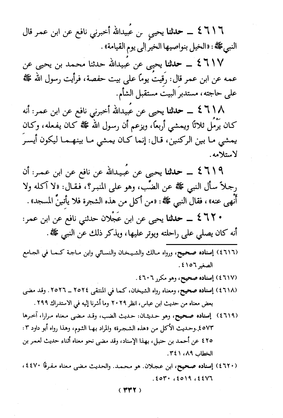 4616 - حدثنا يحيي عن عُبيد الله أخبرني نافع عن ابن عمر قال النبي - صلى الله عليه وسلم -: "الخيل بنواصيها الخيرُ إلي يوم القيامة".