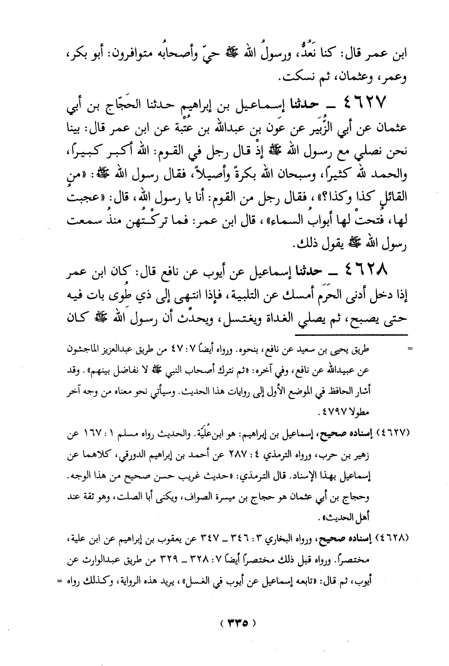 4628 - حدثنا إسماعيل عن أيوب عن نافع قال: كان ابن عمر إذا دخل أدنى الحَرَم أمسك عن التلبية، فإذا انتهى إلى ذي طُوى بات فيه حتى يصبح، ثم يصلي الغداة ويغتسل، ويحدِّث أن رسولَ الله - صلى الله عليه وسلم - كان