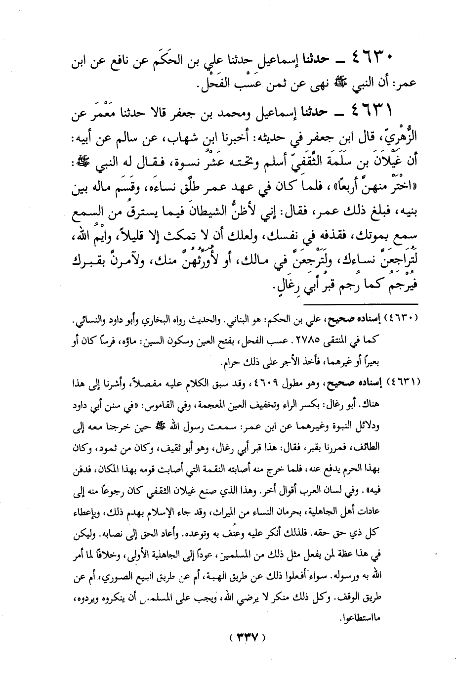 (4631) إسناده صحيح، وهو مطول 4609، وقد سبق الكلام عليه مفصلاً، وأشرنا إلى هذا هناك. أبو رغال: بكسر الراء وتخفيف العين المعجمة، وفي القاموس: "في سنن أبي داود ودلائل النبوة وغيرهما عن ابن عمر: سمعت رسول الله - صلى الله عليه وسلم - حين خرجنا معه إلى الطائف، فمررنا بقبر، فقال: هذا قبر أبي رغال، وهو أبو ثقيف، وكان من ثمود، وكان بهذا الحرم يدفع عنه، فلما خرج منه أصابته النقمة التي أصابت قومه بهذا المكان، فدفن فيه". وفي لسان العرب أقوال أخر. وهذا الذي صنع غيلان الثقفي كان رجوعاً منه إلى عادات أهل الجاهلية، بحرمان النساء من الميراث، وقد جاء الإسلام بهدم ذلك، وبإعطاء كل ذي حق حقه. فلذلك أنكر عليه وعُنف به وتوعده. وأعاد الحق إلى نصابه. وليكن في هذا عظة لمن يفعل مثل ذلك من المسلمين، عوداً إلى الجاهلية الأولى، وخلافاً لما أمر الله به ورسوله. سواء أفعلوا ذلك عن طريق الهبة، أم عن طريق البيع الصوري، أم عن