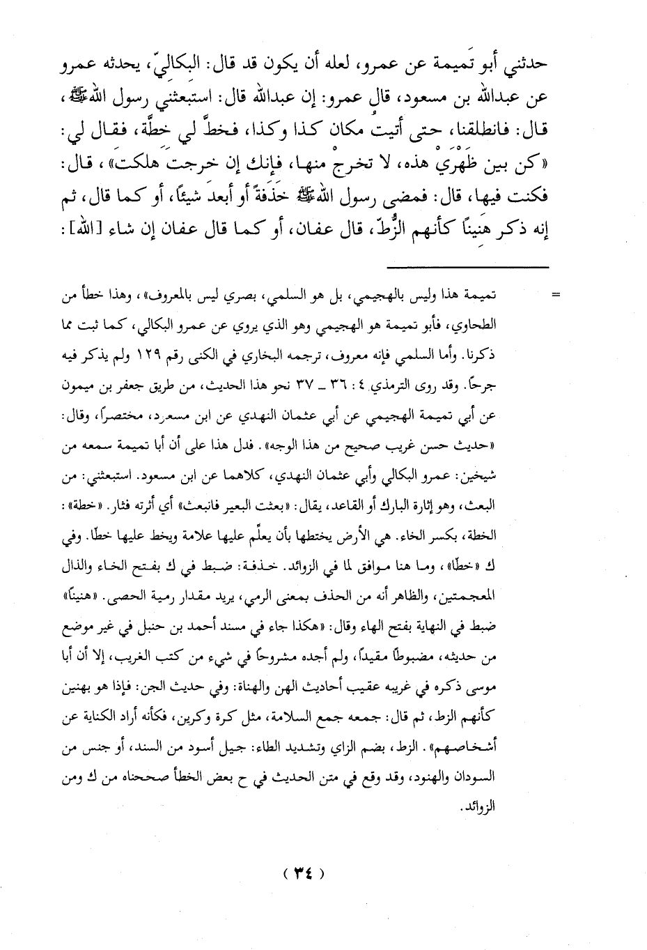 = تميمة هذا وليس بالهجيمي، بل هو السلمي، بصري ليس بالمعروف"، وهذا خطأ من الطحاوي، فأبو تميمة هو الهجيمي وهو الذي يروي عن عمرو البكالي، كما ثبت كما ذكرنا. وأما السلمي فإنه معروف، ترجمه البخاري في الكنى رقم 129ولم يذكر فيه جرحاً. وقد روى الترمذي- 4: 36 - 37 نحو هذا الحديث، من طريق جعفر بن ميمون عن أبي تميمة الهجيمي عن أبي عثمان النهدي عن ابن مسعود، مختصراً، وقال: "حديث حسن غريب صحيح من هذا الوجه". فدل هذا على أن أبا تميمة سمعه من شيخين: عمرو البكالي وأبى عثمان النهدي، كلاهما عن ابن مسعود. استبعثني: من البعث، وهو إثارة المبارك أو القاعد، يقال: "بعثت البعير فانبعث" أي أثرته فثار. "خطة": الخطه، بكسر الخاء. هي الأرض يختطها بأن يعلم عليها علامة ويخط عليها خطأ. وفي ك "خطّا"، وما هنا موافق لما في الزوائد. خذفة: ضبط في ك بفتح الخاء والذال المعجمتين، والظاهر أنه من الحذف بمعنى الرمي، يريد مقدار رمية الحصى. " هنيناً" ضبط في النهاية بفتح الهاء وقال: "هكذا جاء في مسند أحمد بن حنبل في غير موضع من حديثه، مضبوطا مقيداً، ولم أجده مشروط في شيء من كتب الغريب، إلا أن أبا موسى ذكره في غريبه عقيب أحاديث الهن والهناة: وفي حديث الجن: فإذا هو بهنين كأنهم الزط، ثم قال: جمعه جمع السلامة، مثل كرة وكرين، فكأنه أراد الكناية عن أشخاصهم". الزط، بضم الزاي وتشديد الطاء: جيل أسود من المسند، أو جنس من السودان والهنود، وقد وقع في متن الحديث في ح بعض الخطأ صححناه من ك ومن الزوائد.