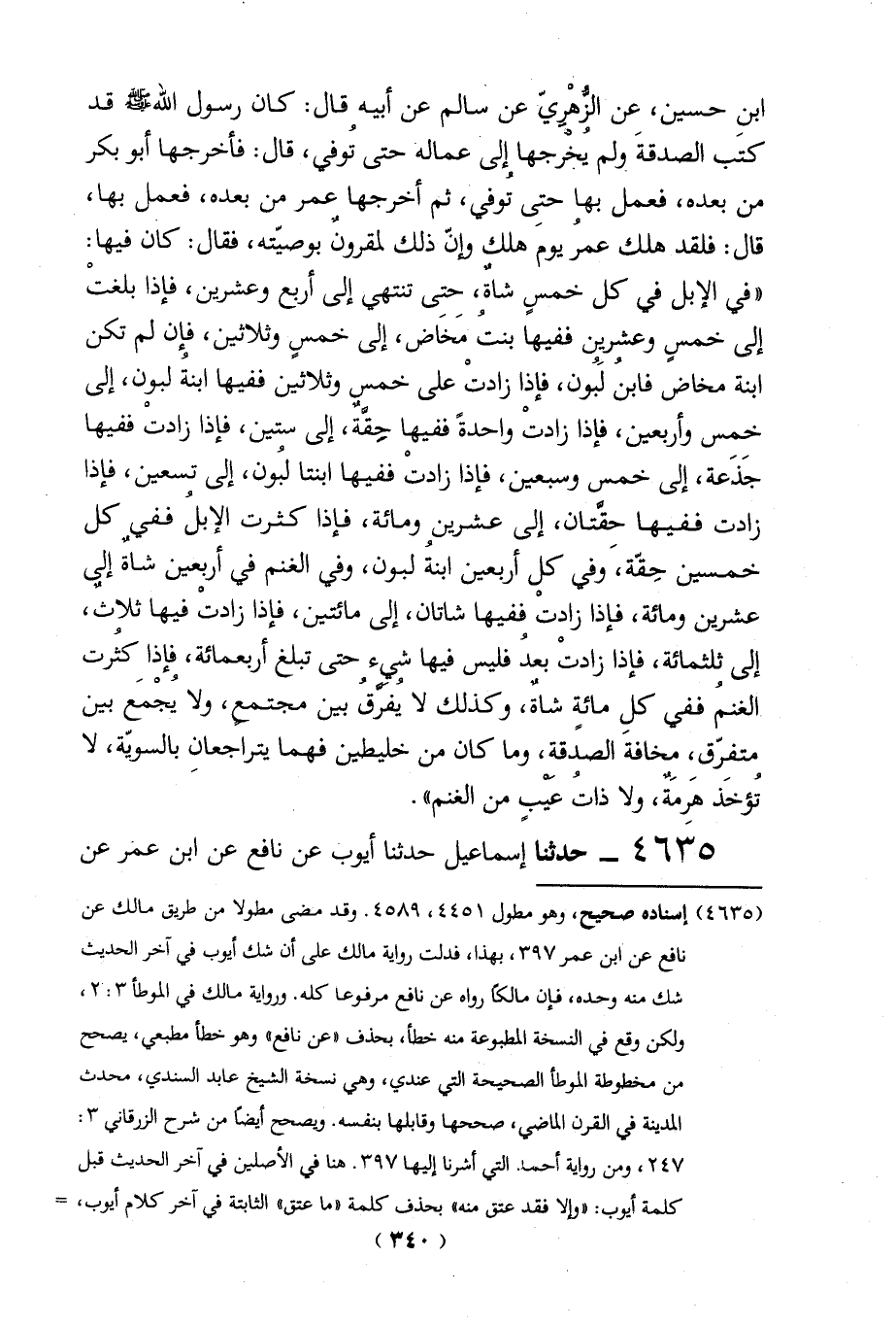 ابن حسين، عن الزُّهْريّ عن سالم عن أبيه قال: كان رسول الله - صلى الله عليه وسلم - قد كتَب الصدقةَ ولم يُخْرجها إلى عماله- حتى تُوفي، قال: فأخرجها أبو بكر من بعده، فعمل بها حتى تُوفي، ثم أخرجها عمر من بعده، فعمل بها، قال: فلقد هلك عمرُ يومَ هلك وإنّ ذلك لمقرونٌ بوصيّته، فقال: كان فيها: "في الإبل في كل خمسٍ شاةٌ، حتى تنتهي إلى أربع وعشرين، فإذا بلغتْ إلى خمس وعشرين ففيها بنتُ مَخَاض، إلى خمسٍ وثلاثين، فإن لم تكن ابنة مخاض فابنُ لَبُون، فإذا زادتْ على خمس وثلاثين ففيها ابنةُ لبون، إلى خمس وأربعين، فإذا زادتْ واحدةً ففيها حِقَّةٌ، إلى ستين، فإذا زادت ففيها جَذَعة، إلى خمس وسبعين، فإذا زادتْ ففيها ابنتا لبُون، إلى تسعين، فإذا زادت ففيها حِقَّتان، إلى عشرين ومائة، فإذا كثرت الإبلُ ففي كل خمسين حِقّة، وفي كل أربعين ابنةُ لبون، وفي الغنم في أربعين شاهٌ إلى عشرين ومائة، فإذا زادتْ ففيها شاتان، إلى مائتين، فإذا زادتْ فيها ثلاثٌ، إلى ثلثمائة، فإذا زادتْ بعدُ فليس فيها شيء حتى تبلغ أربعمائة، فإذا كِثُرت الغنمُ ففي كل مائة شاهٌ، وكذلك لا يُفَرَّقُ بين مجتمع، ولا يُجْمع بين متفرّق، مخافةَ الصدقة، وما كان من خليطين فهما يتراجعانِ بالسويّة، لا تُؤخَذ هَرِمَةٌ، ولا ذاتُ عَيْبٍ من الغنم".