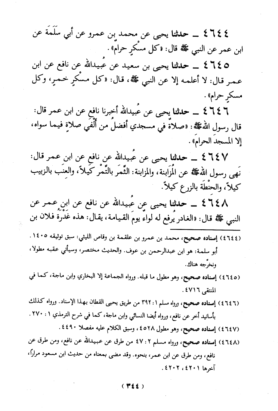 4644 - حدثنا يحيى عن محمد بن عمرو عن أبي سَلَمَة عن ابن عمر عن النبي -صلي الله عليه وسلم - صلى الله عليه وسلم - قال: "كل مسْكرٍ حرامٌ".