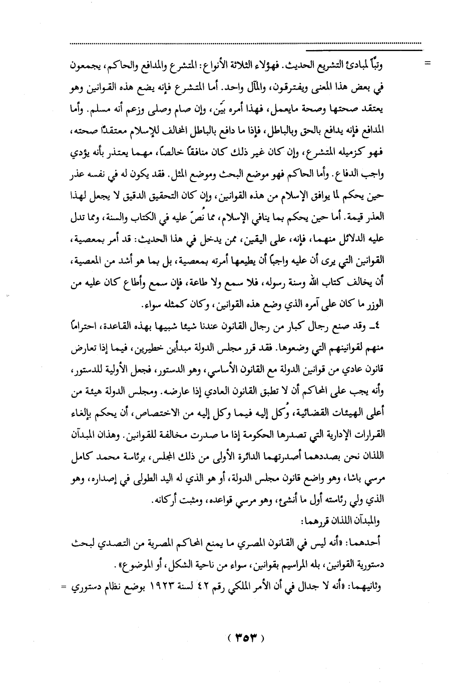 = وتبَّاً لمبادئ التشريع الحديث. فهؤلاء الثلاثة الأنواع: المتشرع والمدافع والحاكم، يجمعون في بعض هذا المعنى ويفترقون، والمآل واحد. أما المتشرع فإنه يضع هذه القوانين وهو يعتقد صحتها وصحة ما يعمل، فهذا أمره بَين، وإن صام وصلى وزعم أنه مسلم. وأما المدافع فإنه يدافع بالحق وبالباطل، فإذا ما دافع بالباطل المخالف للإسلام معتقداً صحته، فهو كزميله المتشرع، وإن كان غير ذلك كان منافقاً خالصاً، مهما يعتذر بأنه يؤدي واجب الدفاع. وأما الحاكم فهو موضع البحث وموضع المثل. فقد يكون له في نفسه عذر حين يحكم لما يوافق الإسلام من هذه القوانين، وإن كان التحقيق الدقيق لا يجعل لهذا العذر قيمة. أما حين يحكم بما ينافي الإسلام، مما نُصّ عليه في الكتاب والسنة، ومما تدل عليه الدلائل منهما، فإنه، على اليقين، ممن يدخل في هذا الحديث: قد أمر بمعصية، القوانين التى يرى أن عليه واجباً أن يطيعها أمرته بمعصية، بل بما هو أشد من المعصية، أن يخالف كتاب الله وسنة رسوله، فلا سمع ولا طاعة، فإن سمع وأطاع كان عليه من الوزن ما كان على آمره الذي وضع هذه القوانين، وكان كمثله سواء.