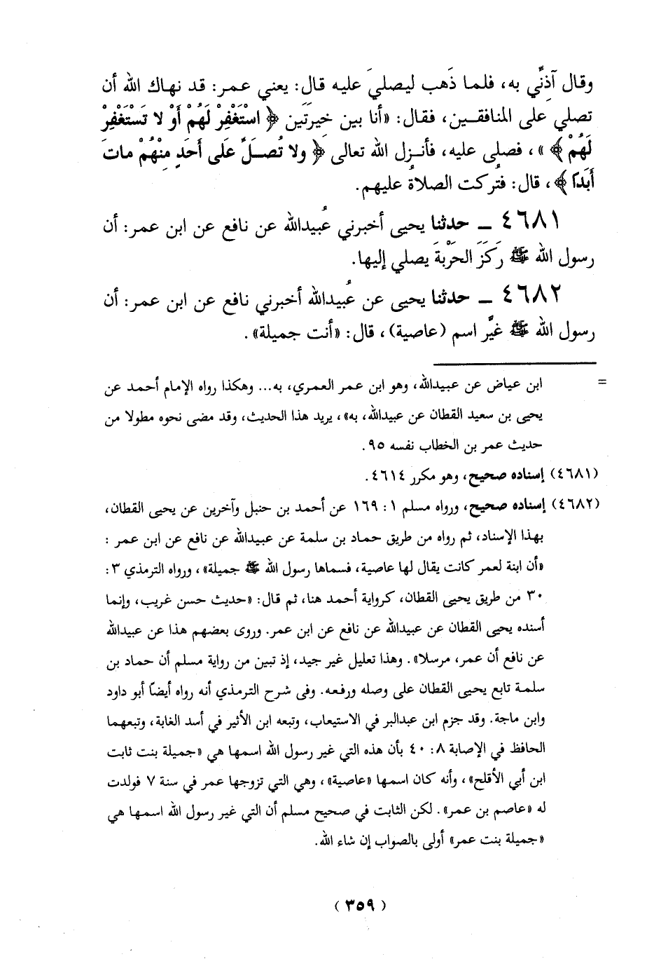 (4682) إسناده صحيح، ورواه مسلم 1: 169 عن أحمد بن حنبل وآخرين عن يحيى القطان، بهذا الإسناد، ثم رواه من طريق حماد بن سلمة عن عُبيد الله عن نافع عن ابن عمر: "أن ابنة لعمر كانت يقال لها عاصية، فسماها رسول الله - صلى الله عليه وسلم - جميلة"، ورواه الترمذي 3: 30 من طريق يحيى القطان، كرواية أحمد هنا، ثم قال: "حديث حسن غريب، وإنما أسنده يحيى القطان عن عُبيد الله عن نافع عن ابن عمر. وروى بعضهم هذا عن عُبيد الله عن نافع أن عمر، مرسلاً". وهذا تعليل غير جيد، إذ تبين من رواية مسلم أن حماد بن سلمة تابع يحيى القطان على وصله ورفعه. وفي شرح الترمذي أنه رواه أيضاً أبو داود وابن ماجة. وقد جزم ابن عبد البر في الاستيعاب، وتبعه ابن الأثير في أسد الغابة، وتبعهما الحافظ في الإصابة 8: 40 بأن هذه التي غير رسول الله اسمها هي "جميلة بنت ثابت ابن أبي الأقلح"، وأنه كان اسمها "عاصية"، وهي التي تزوجها عمر في سنة 7 فولدت له "عاصم بن عمر". لكن الثابت في صحيح مسلم أن التي غير رسول الله اسمها هي "جميلة بنت عمر" أولى بالصواب إن شاء الله.