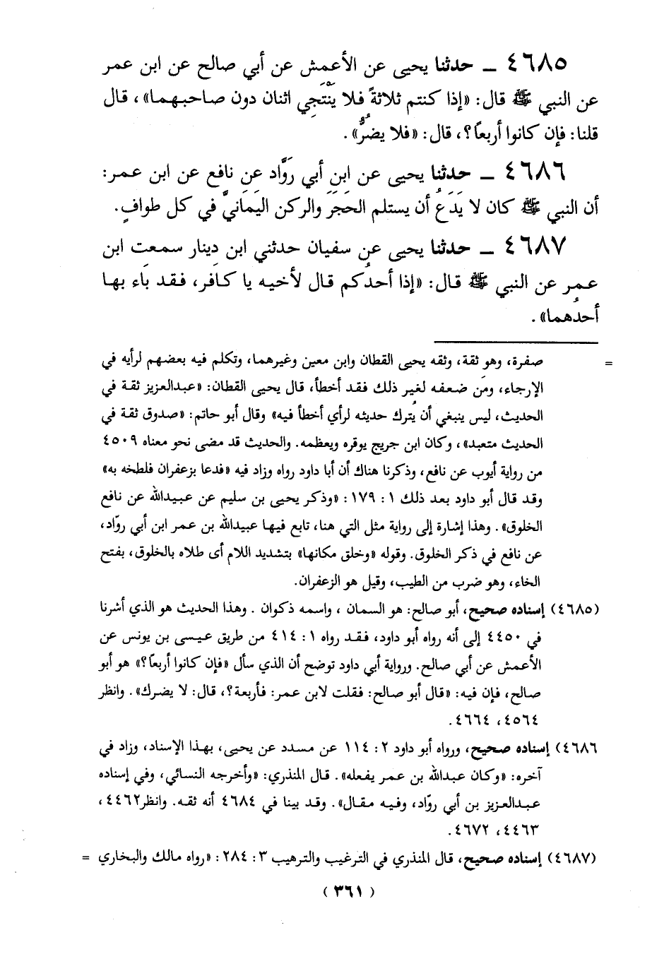 (4685) إسناده صحيح، أبو صالح: هو السمان، واسمه ذكوان. وهذا الحديث هو الذي أشرنا في 4450 إلى أنه رواه أبو داود، فقد رواه 1: 414 من طريق عيسى بن يونس عن الأعمش عن أبي صالح. ورواية أبي داود توضح أن الذي سأل "فإن كانوا أربعاً؟ " هو أبو صالح، فإن فيه: "قال أبو صالح: فقلت لابن عمر: فأربعة؟، قال: لا يضرك". وانظر 4564 , 4664.