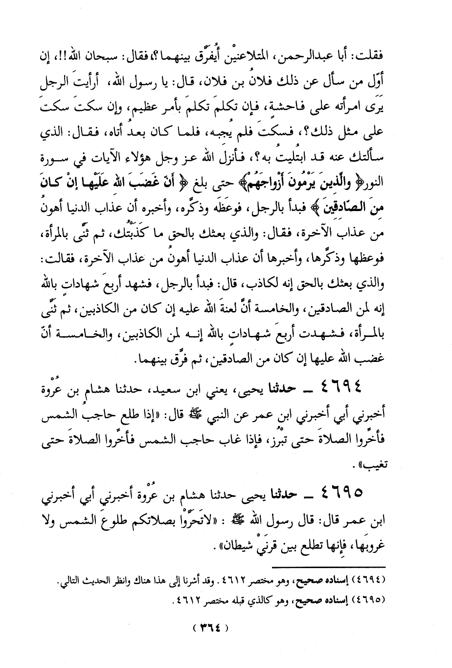 فقلت: أبا عبد الرحمن، المتلاعنيْن أيُفَرَّق بينهما؟، فقال: سبحان الله!!، إن أِوِّل من سأل عن ذلك فلانُ بن فلان، قال: يا رسول الله، أرأيت الرجل يرى امرأته على فاحشةٍ، فإن تكلمَ تكلمَ بأمر عظيم، وإن سكتَ سكتَ على مثل ذلك؟، فسكتَ فلم يُجبه، فلما كان بعدُ أتاه، فقال: الذي