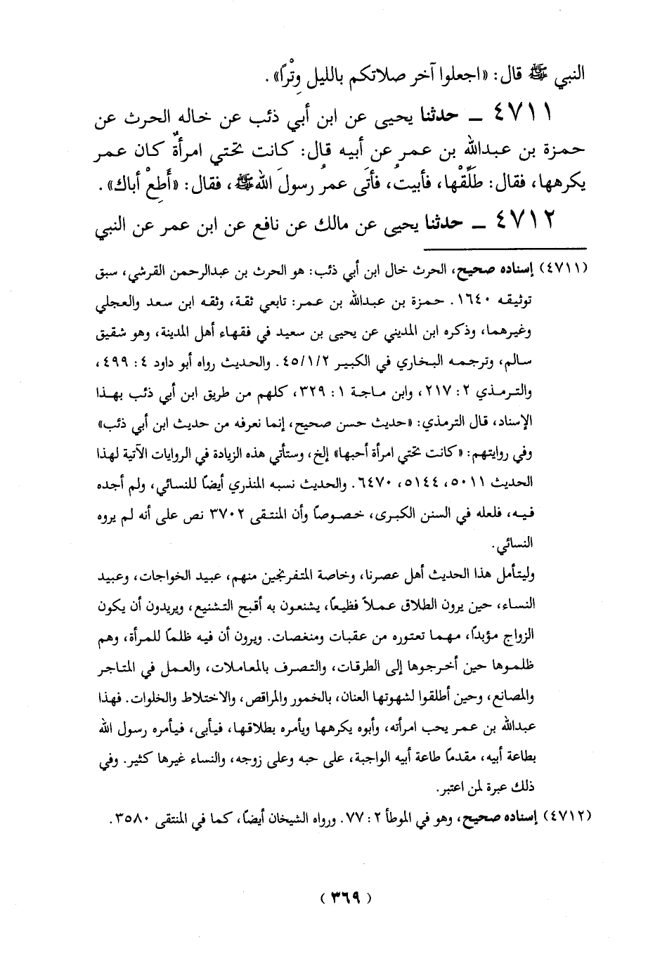 4711 - حدثنا يحيى عن ابن أبي ذئب عن خاله الحرث عن حمزة بن عبد الله بن عمر عن أبيه قال: كانت تحتي امرأهٌ كان عمر يكرهها، فقال: طَلَّقْها، فأبيتُ، فأتَى عمرُ رسولَ الله - صلى الله عليه وسلم -، فقال: "أطِعْ أباك".