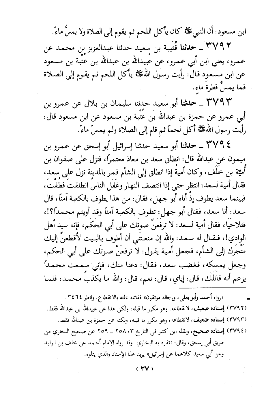 3793 - حدثنا أبو سعيد حدثنا سليمان بن بلال عن عمرو بن أبي عمرو عن حمزة بن عبد الله بن عتبة بن مسعود عن ابن مسمعود قال: رأيت رسول الله - صلى الله عليه وسلم - أكل لحماً ثم قام إلى الصلاة ولم يمسّ مماءً.