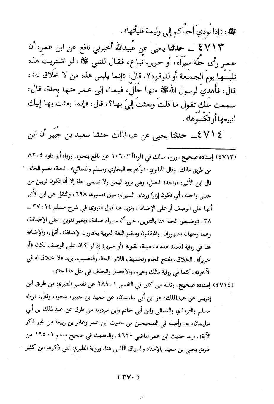 4713 - حدثنا يحيى عن عُبيد الله أخبرني نافع عن ابن عمرِ: أن عمر رأى حُلة سيَرَاءَ، أو حرير، تُباع، فقال للنبي - صلى الله عليه وسلم -: لو اشتريتَ هذه تلبَسُها يومَ الجمَعة أو للوفود؟، قال: "إنما يلبس هذه من لا خَلاق له"، قال: فأُهديَ لرسول الله -صلي الله عليه وسلم - منها حُلَلٌ، فبعث إلى عمر منها بحلة، قال: سمعت مَنك تقول ما قلتَ وبعثتَ إليّ بها؟، قال: "إنما بعثتُ بها إليك