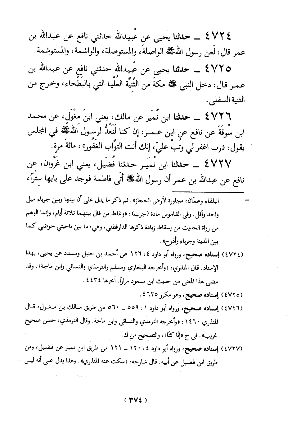 4726 - حدثنا ابن نُمَير عن مالك، يعني ابنَ مغْوَلٍ، عن محمد ابن سُوقَةَ عن نافع في ابن عمر: إن كنا لَنَعُدُّ لرسول اَلله - صلى الله عليه وسلم - في المجلس يقول: "رب اغفر لي وتُبْ عليّ، إنك أنت التوَّاب الغَفُور"، مائةَ مرة.