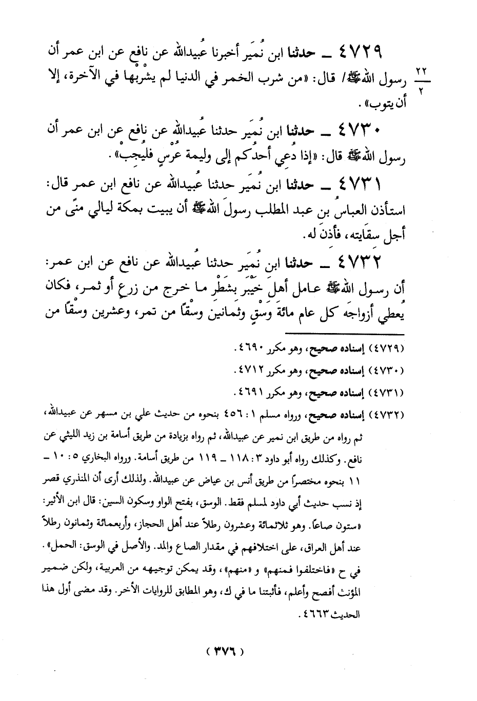 4730 - حدثنا ابن نُمَير حدثنا عُبيد الله عن نافع عن ابن عمر أن رسول الله -صلي الله عليه وسلم - قال: "إذا دُعِي أحدُكم إلى وليمة عُرْسٍ فليُجِبْ".