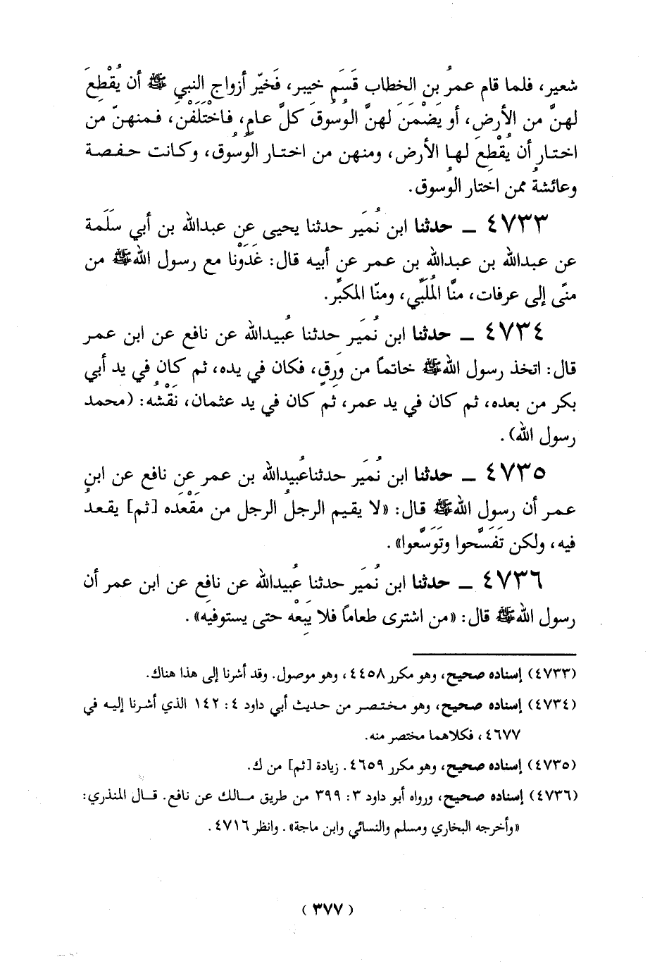 4736 - حدثنا ابن نُمَير حدثنا عُبيد الله عن نافِع عن ابن عمر أن رسول الله -صلي الله عليه وسلم - قال: "من اشترى طعاماً فلا يَبِعْه حتى يستوفيه".