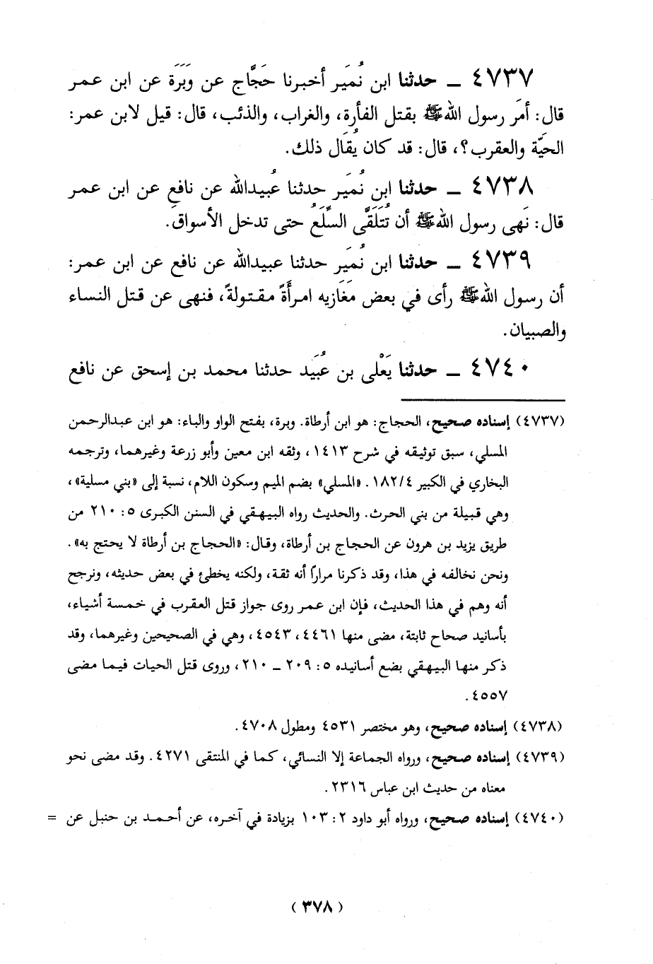 4739 - حدثنا ابن نُمَير حدثنا عُبيد الله عن نافع عن ابن عمر: أن رسول الله -صلي الله عليه وسلم - رأى في بعض مَغَازيه امرأَةً مقتولةً، فنهى عن قتل النساء والصبيان.