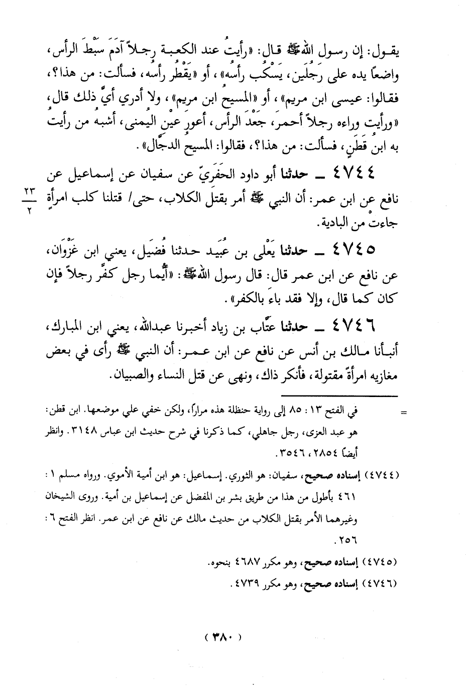 4744 - حدثنا أبو داود الحَفَرِيّ عن سفيان عن إسماعيل عن نافع عن ابن عمر: أن النبي -صلي الله عليه وسلم - أمر بقتل الكلاب، حتى قتلنا كلب امرأةٍ جاءت من البادية.