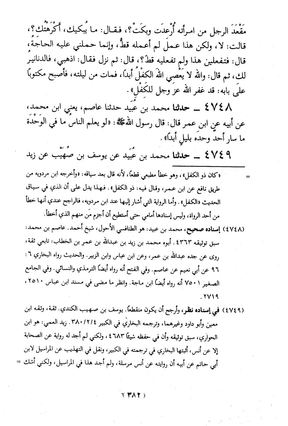 4748 - حدثنا محمد بن عُبَيد حدثنا عاصم، يعني ابن محمد، عن أبيه عن ابنِ عمر قال: قال رسول الله -صلي الله عليه وسلم -: "لو يعلم الناسُ ما في الوَحْدَة ما سار أحدٌ وحده بليلٍ أبداً".