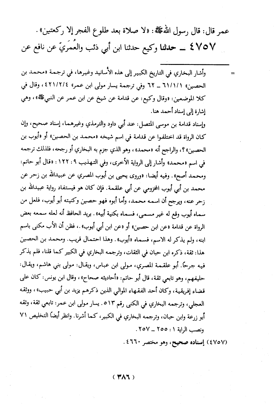 وإسناد قدامة بن موسى المتصل: عند أبي داود والترمذي وغيرهما، إسناد صحيح، وإن كان الرواة قد اختلفوا عن قدامة في اسم شيخه "محمد بنْ الحصين" أو "أيوب بن الحصين"؟، والراجع أنه "محمد"، وهو الذي جزم به البخاري أو رجحه، فلذلك ترجمه في اسم "محمد" وأشار إلى الرواية الأخرى، وفي التهذيب 9: 122: "قال أبو حاتم: ومحمد أصح". وفيه أيضاً: "وروى يحيى بن أيوب المصري عن عُبيد الله بن زحر عن محمد بن أبي أيوب المخزومي عن أبي علقمة. فإن كان هو فيستفاد رواية عُبيد الله بن زحر عنه، ويرجع أن اسمه محمد، وأما أبوه فهو حصين وكنيته أبو أيوب، فلعل من سماه أيوب وقع له غير مسمى، فسماه بكنية أبيه". يريد الحافظ أنه لعله سمعه بعض الرواة عن قدامة "عن ابن حصين" أو "عن ابن أبي أيوب".، فظن أن الأب مكني باسم ابنه، ولم يذكر له الاسم، فسماه "أيوب". وهذا احتمال قريب. ومحمد بن الحصين هذا: ثقة، ذكره ابن حبان في الثقات، وترجمه البخاري في الكبير كما قلنا، فلم يذكر فيه جرحاً. أبو علقمة المصري، مولى ابن عباس، ويقال: مولى بني هاشم، ويقال: حليفهم، وهو تابعي ثقة، قال أبو حاتم: "أحاديثه صحاح"، وقال ابن يونس: كان على قضاء إفريقية، وكان أحد الفقهاء الموالي الذين ذكرهم يزيد بن أبي حبيب"، ووثقه العجلي، وترجمه البخاري في الكنى رقم 513. يسار مولى ابن عمر: تابعي ثقة، وثقه أبو زرعة وابن حبان، وترجمه البخاري في الكبير، كما أشرنا. وانظر أيضاً التخليص 71 ونصب الراية 1: 255 - 257.