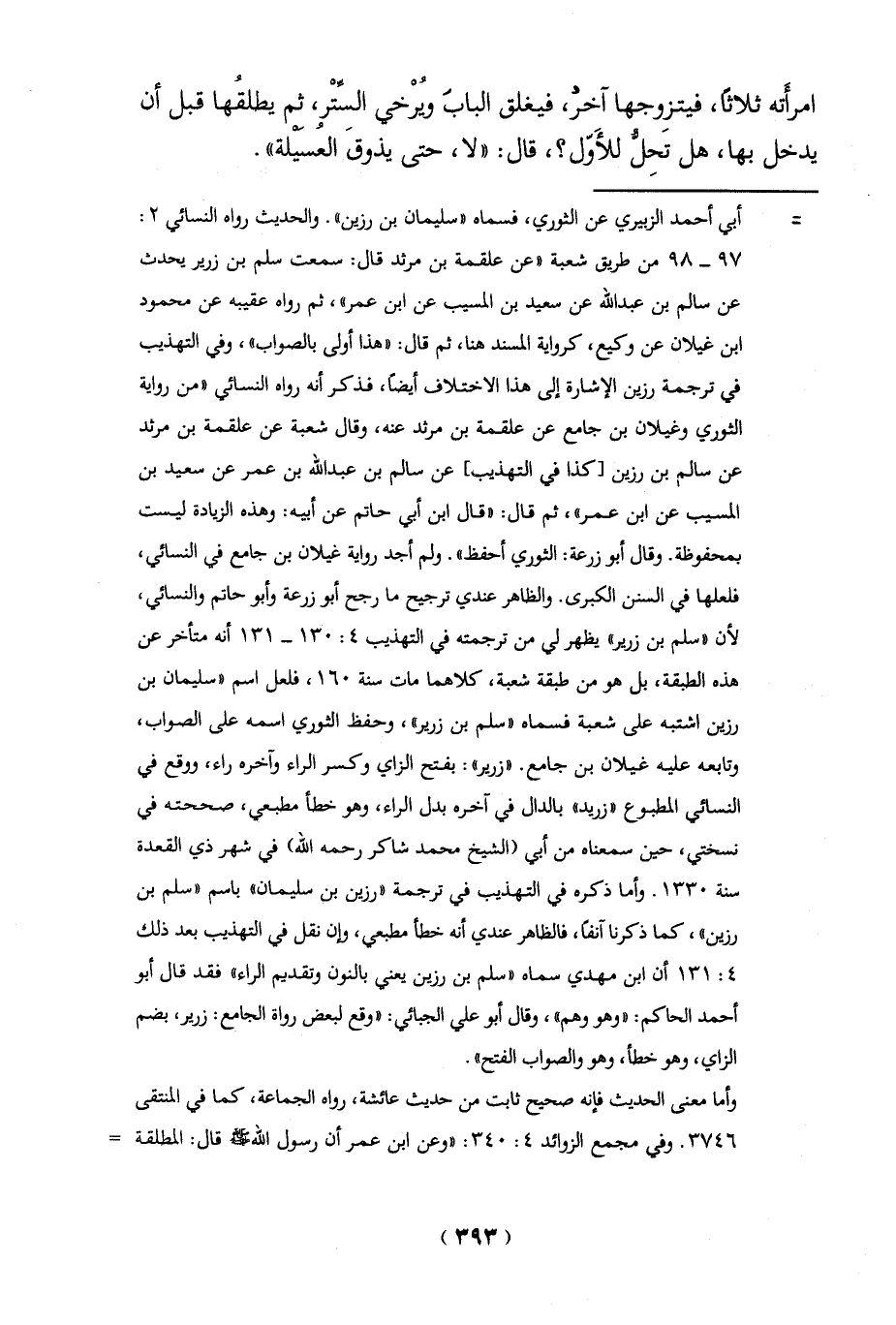 وتابعه عليه غيلان بن جامع. "زرير": بفتح الزاي وكسر الراء وآخره راء، ووقع في النسائي المطبوع "زريد" بالدال في آخره بدل الراء، وهو خطأ مطبعي، صححته في نسختي، حين سمعناه من أبي "الشيخ محمد شاكر رحمه الله" في شهر ذي القعدة سنة 1330. وأما ذكره في التهذيب في ترجمة "رزين بن سليمان" باسم "سلم بن رزين"، كما ذكرنا آنفاً، فالظاهر عندي أنه خطأ مطبعي، وإن نقل في التهذيب بعد ذلك 4: 131 أن ابن مهدي سماه "سلم بن رزين يعني بالنون وتقديم الراء" فقد قال أبو أحمد الحاكم: "وهو وهم"، وقال أبو علي الجبائي:"وقع لبعض رواة الجامع: زرير، بضم الزاي، وهو خطأ، وهو والصواب الفتح".
