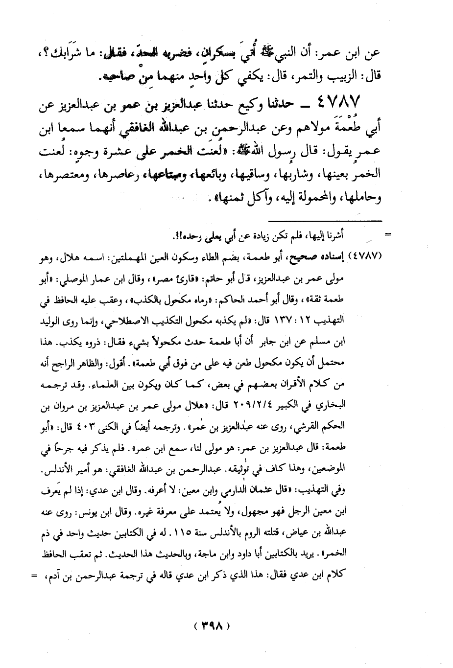 4787 - حدثنا وكيع حدنْنا عبد العزيز بن عمر عبد العزيز عن أبي طُعْمَةَ مولاهم وعن عبد الرحمن بن عبد الله الغافقي أنهما سمعا ابن عمر يقول: قال رسول الله -صلي الله عليه وسلم -: "لُعنَت الخمر. علي عشرة وجوهٍ: لُعنت الخمرُ بعينها، وشاربُها، وساقيها، وبائعها، ومبتاعها، وعاصرها، ومعتصرها، وحاملها، والمحمولة إليه، وآكل ثمنها"