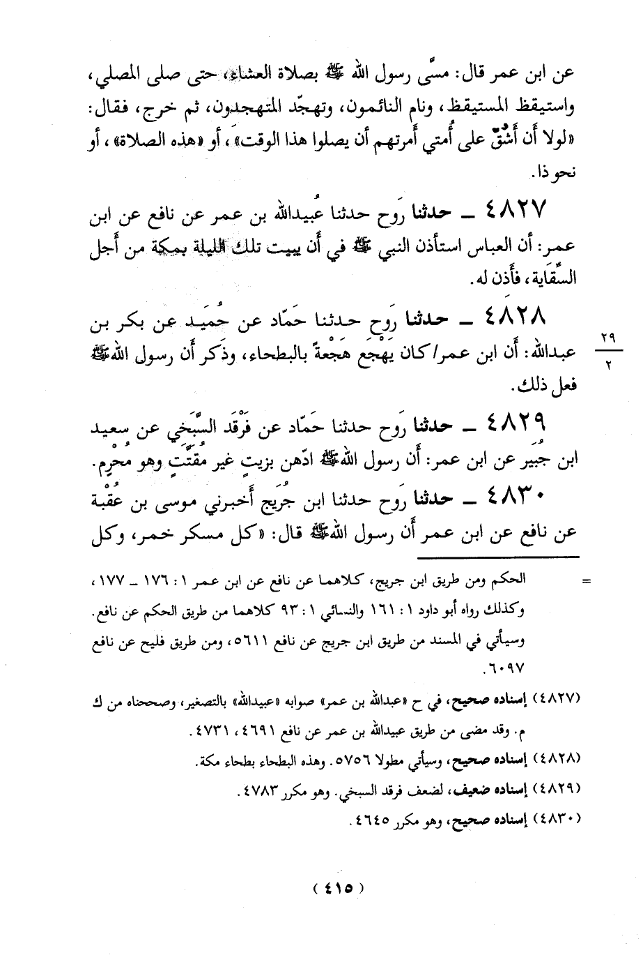 عن ابن عمر قال: مسَّى رسول الله -صلي الله عليه وسلم - بصلاة العشاء:، حتى صلى المصلي، واستيقظ المستيقظ، ونام النائمون، وتهجّد المتهجدون، ثم خرج، فقال: "لولا أن اشُق على أُمتي أمرتهم أن يصلوا هذا الوقت"، أو "هذه الصلاة"، أو نحو ذا.