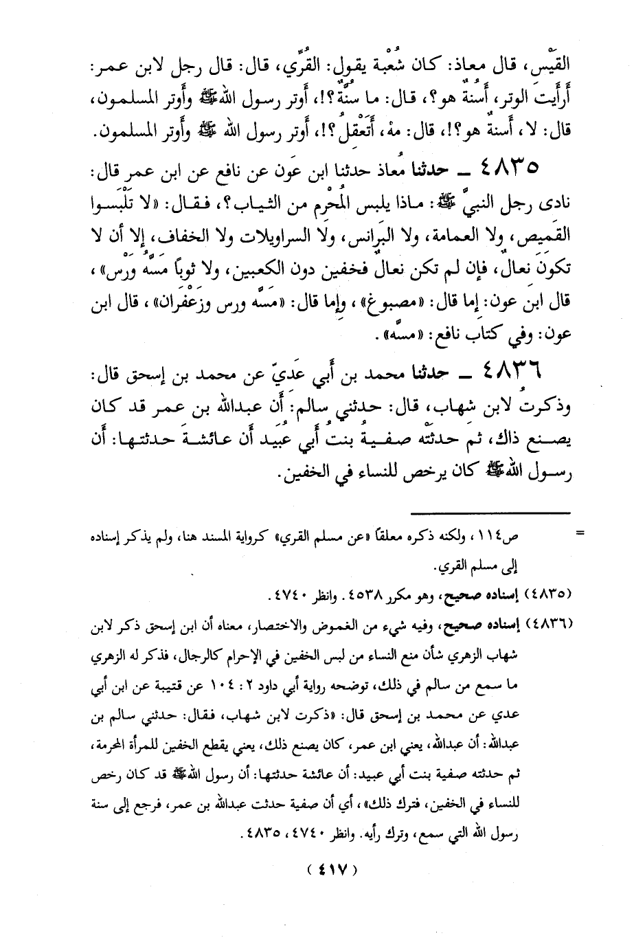 4836 - حدثنا محمد بن أبي عَديّ عن محمد بن إسحق قال: وذكرتُ لابن شِهاب، قال: حدثني سالم": أن عبد الله بن عمر قد كان يصنع ذاك، ثم حدثته صفيةُ بنتُ أبي عُبَيد أن عائشةَ حدثتها: أن رسول الله -صلي الله عليه وسلم - كان يرخص للنساء في الخفين.