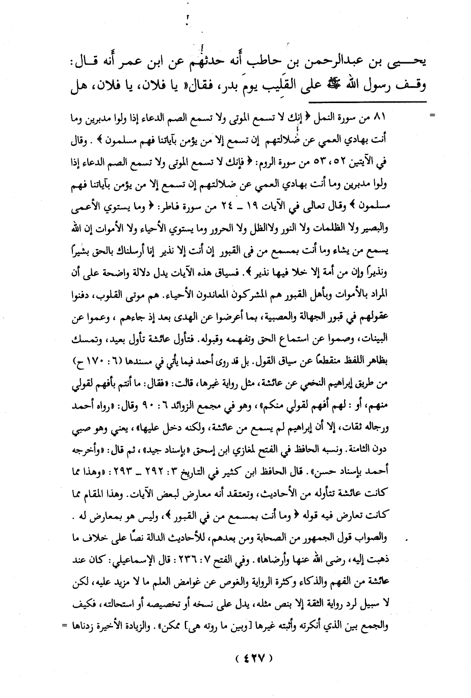 = 81 من سورة النمل {إِنَّكَ لَا تُسْمِعُ الْمَوْتَى وَلَا تُسْمِعُ الصُّمَّ الدُّعَاءَ إِذَا وَلَّوْا مُدْبِرِينَ (80) وَمَا أَنْتَ بِهَادِي الْعُمْيِ عَنْ ضَلَالَتِهِمْ إِنْ تُسْمِعُ إِلَّا مَنْ يُؤْمِنُ بِآيَاتِنَا فَهُمْ مُسْلِمُونَ (81)} في الآيتين 52، 53 من سورة الروم: {فَإِنَّكَ لَا تُسْمِعُ الْمَوْتَى وَلَا تُسْمِعُ الصُّمَّ الدُّعَاءَ إِذَا وَلَّوْا مُدْبِرِينَ (52) وَمَا أَنْتَ بِهَادِ الْعُمْيِ عَنْ ضَلَالَتِهِمْ إِنْ تُسْمِعُ إِلَّا مَنْ يُؤْمِنُ بِآيَاتِنَا فَهُمْ مُسْلِمُونَ (53)} وقال تعالى في الآيات 19 - 24 من سورة فاطر: {وَمَا يَسْتَوِي الْأَعْمَى وَالْبَصِيرُ (19) وَلَا الظُّلُمَاتُ وَلَا النُّورُ (20) وَلَا الظِّلُّ وَلَا الْحَرُورُ (21) وَمَا يَسْتَوِي الْأَحْيَاءُ وَلَا الْأَمْوَاتُ إِنَّ اللَّهَ يُسْمِعُ مَنْ يَشَاءُ وَمَا أَنْتَ بِمُسْمِعٍ مَنْ فِي الْقُبُورِ (22) إِنْ أَنْتَ إِلَّا نَذِيرٌ (23) إِنَّا أَرْسَلْنَاكَ بِالْحَقِّ بَشِيرًا وَنَذِيرًا وَإِنْ مِنْ أُمَّةٍ إِلَّا خَلَا فِيهَا نَذِيرٌ (24)} فسياق هذه الآيات يدل دلالة واضحة على أن المراد بالأموات وبأهل القبور هم المشوكون المعاندون الأحياء. هم موتى القلوب، دفنوا عقولهم في قبور الجهالة والعصبية، بما أعرضوا عن الهدى بعد إذ جاءهم، وعموا عن البينات، وصموا عن استماع الحق وتفهمه وقبوله. فتأول عائشة تأول بعيد، وتمسك بظاهر اللفظ منقطعاً عن سياق القول. بل قد روى أحمد فيما يأتي في مسندها (6: 170 ح) من طريق إبراهيم النخعي عن عائشة، مثل رواية غيرها، قالت: "فقال: ما أنتم بأفهم لقولي