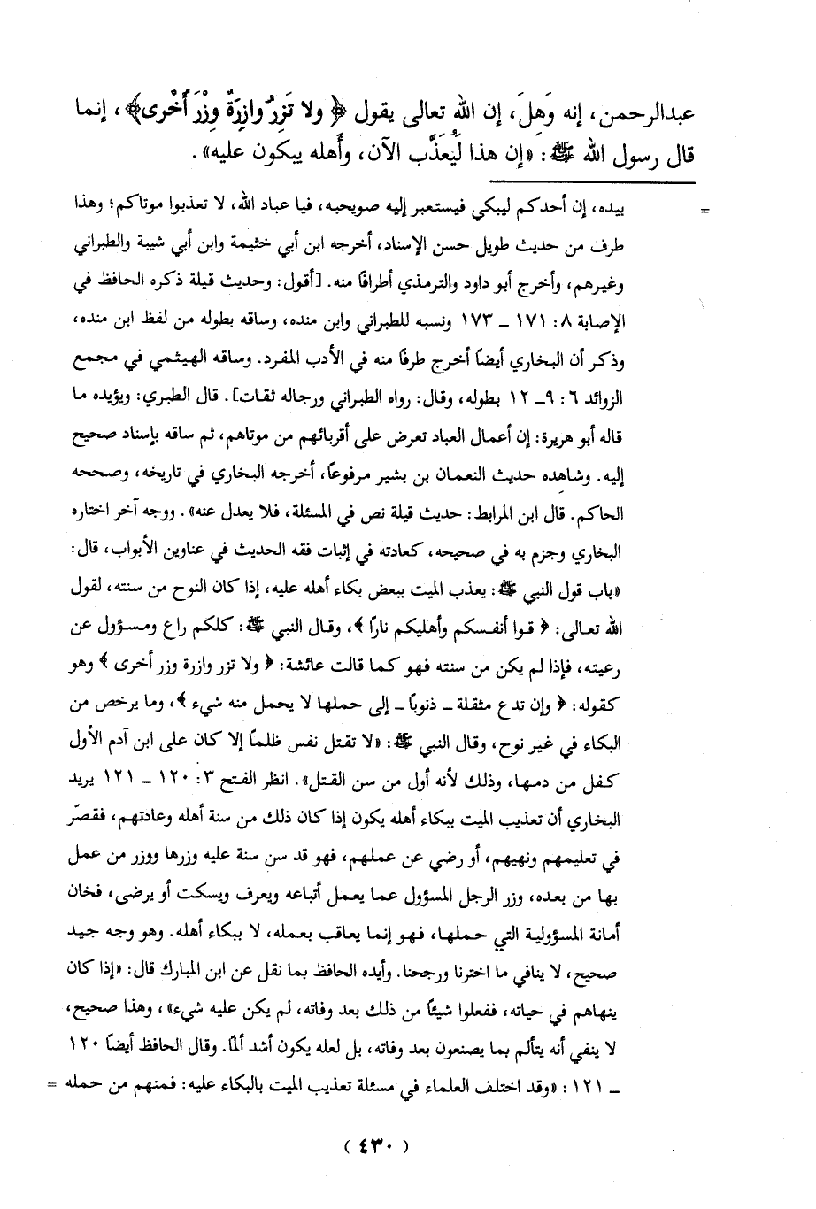 عبد الرحمن، إنه وَهلَ، إن الله تعالى يقول {وَلَا تَزِرُ وَازِرَةٌ وِزْرَ أُخْرَى}، إنما قال رسول الله - صلى الله عليه وسلم -: "إن هذا لَيُعَذَّب الآن، وأهله يبكون عليه".