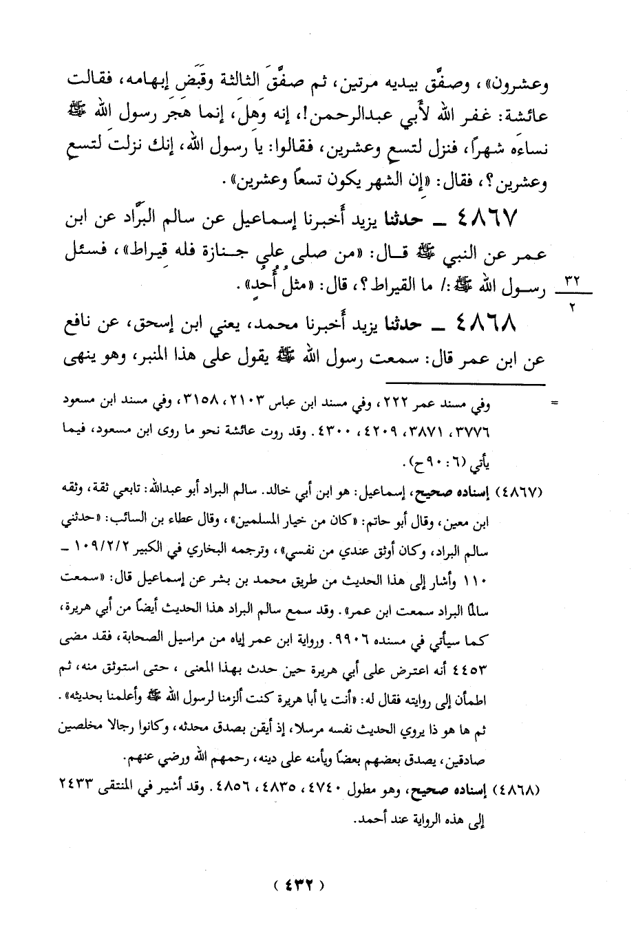 4867 - حدثنا يزيد أخبرنا إسماعيل عن سالم البَرَّاد عن ابن عمر عن النبي -صلي الله عليه وسلم - قال: "من صلى على جنازة فله قِيراط"، فسئل رسول الله -صلي الله عليه وسلم -: ما القيراط؟، قال:"مثلُ أُحُدٍ".