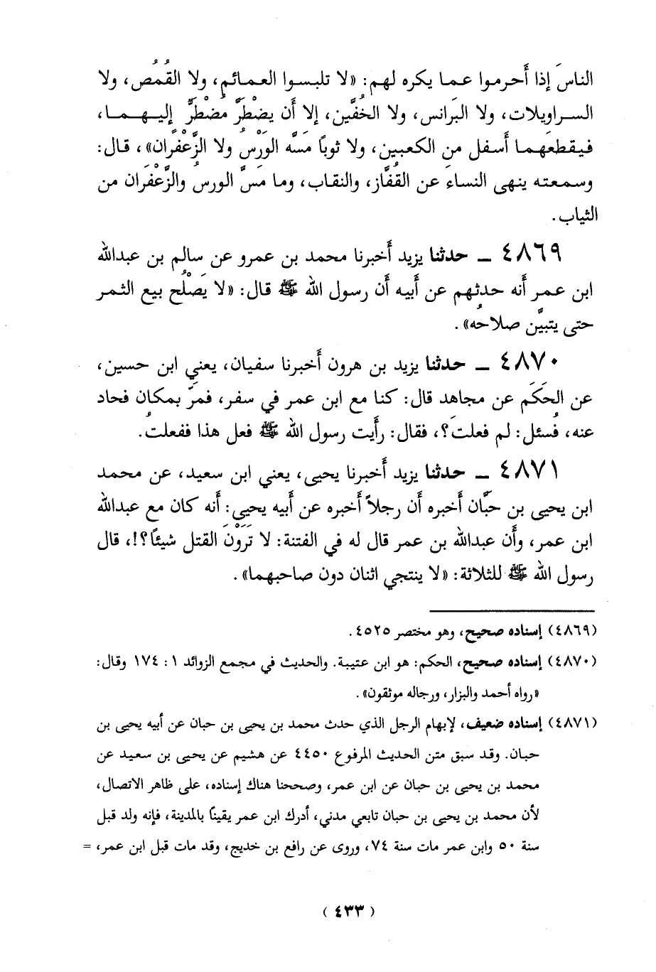 4871 - حدثنا يزيد أخبرنا يحيى، يعني ابن سعيد، عن محمد ابن يحيى بن حَيَّان أخبره أَن رجلا أخبره عن أبيه يحيِىِ: أَنه كان مع عبد الله ابن عمر، وأَن عبد الله بن عمر قال له في الفتنة: لا ترونَ القتل شيئاً؟!، قال رسول الله -صلي الله عليه وسلم - للثلاثة: "لا ينتجي اثنان دون صاحبهما".