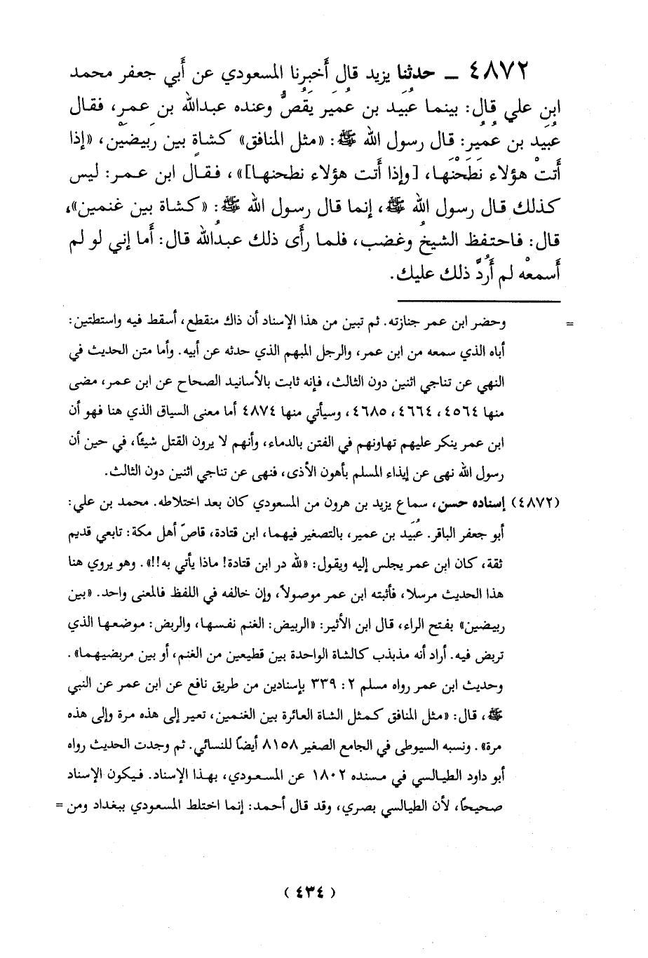 (4872) إسناده حسن، سماع يزيد بن هرون من المسعودي كان بعد اختلاطه. محمد بن علي: أبو جعفر الباقر. عُبَيد بن عمير، بالتصغير فيهما، ابن قتادة، قاص أهل مكة: تابعي قديم ثقة، كان ابن عمر يجلس إليه ويقول: "لله در ابن قتادة! ماذا يأتي به!! ". وهو يروي هنا هذا الحديث مرسلاً، فأثبته ابن عمر موصولاً، وإن خالفه في اللفظ فالمعنى واحد."بين ربيضين" بفتح الراء، قال ابن الأثير: "الربيض: الغنم نفسها، والربض: موضعها الذي تربض فيه. أراد أنه مذبذب كالشاة الواحدة بين قطيعين من الغنم، أو بين مربضيهما".