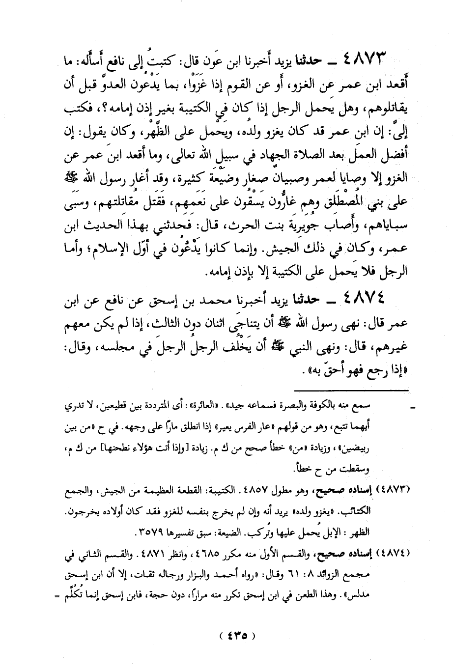 4873 - حدثنا يزيد أخبرنا ابن عَون قال: كتبتُ إلى نافع أَسأَله: ما أَقعد ابن عمر عن الغزو، أو عن القوم إذا غَزَوْا، بما يَدْعُون العدوّ قبل أن يقاتلوهم، وهل يَحمل الرجل إذا كان في الكتيبة بغير إذن إمامه؟، فكتب إلىَّ: إن ابن عمر قد كان يغزو ولدُه، ويَحْمل على الظَّهْر، وكان يقول: إن أفضل العمَل بعد الصلاة الجهاد في سبيلِ الله تعالى، وما أقعد ابنَ عمر عن الغزو إلا وصايا لعمر وصبيانٌ صِغار وضَيْعَة كثيرة، وقد أغار رسول الله - صلى الله عليه وسلم - على بني المُصطَلق وهِم غارُّون يَسْقُون على نَعَمِهِم، فَقَتل مُقاتلتهم، وسَبَى سباياهم، وأَصابَ جُويرِيَة بنت الحرث، قال: فحدثني بهذاَ الحديث ابن عمر، وكان في ذلك الجيش. وإنما كانوا يَدْعُون في أوَّل الإسلام؟ وأما الرجل فلا يَحمل على الكتيبة إلا بإذن إمامه.