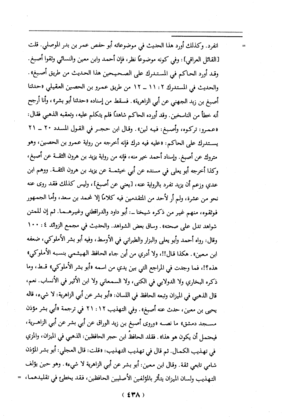والحديث في المستدرك 2: 11 - 12 من طريق عمرو بن الحصين العقيلي" حدثنا أصبغ بن زيد الجهني عن أبي الزاهرية". فسقط من إسناده "حدثنا أبو بشر"، وأنا أرجع أنه خطأ من الناسخين. وقد أورده الحاكم شاهداً فلم يتكلم عليه، وتعقبه الذهبي فقال: "عمرو: تركوه، وأصبغ: فيه لين". وقال ابن حجر في القول المسدد 20 - 21 يستدرك على الحاكم: "عليه فيه درك فإنه أخرجه من رواية عمرو بن الحصين، وهو متروك عن أصبغ. وإسناد أحمد غير منه، فإنه من رواية يزيد بن هرون الثقة عن أصبغ، وكذا أخرجه أبو يعلى في مسنده عن أبي خيثمة عن يزيد بن هرون الثقة. ووهم ابن عدي وزعم أن يزيد تفرد بالرواية عنه، [يعني عن أصبغ]، وليس كذلك فقد روى عنه نحو من عشرة، ولم أو لأحد من المتقدمين فيه كلاماً إلا لمحمد بن سعد، وأما الجمهور فوثقوه، منهم غير من ذكره شيخنا-: أبو داود والدراقطني وغيرهما. ثم إن للمتن شواهد تدل على صحته". وساق بعض الشواهد والحديث في مجمع الزوائد 4: 100 وقال: رواه أحمد وأبو يعلى والبزار والطبراني في الأوسط، وفيه أبو بشر الأملوكي، ضعفه ابن معين". هكذا قال!!، ولا أدري من أين جاء الحافظ الهيثمي بنسبه الأملوكي" هذه؟!، فما وجدت في المراجع التي بين يدي من اسمه "أبو بشر الأملوكي" قط، وما ذكره البخاري ولا الدولابي في الكنى، ولا السمعانى ولا ابن الأثير في الأنساب. نعم، قال الذهبي في الميزان وتبعه الحافظ في اللسان: "أبو بشر عن أبي الزاهرية: لا شيء، قاله يحيى بن معين، حدث عنه أصبغ". وفي التهذيب 12: 21 في ترجمة "أبي بشر مؤذن مسجد دمشق" ما نصه "وروى أصبغ بن زيد الوراق عن أبي بشر عن أبي الزاهرية، فيحتمل أن يكون هو هذا". فقلد الحافظُ ابن حجر الحافظين: الذهبي في الميزان، والمزي في تهذيب الكمال. ثم قال في تهذيب التهذيب: "قلت: قال العجلي: أبو بشر المؤذن شامي تابعي ثقة. وقال ابن معين: أبو بشر عن أبي الزاهرية لا شيء". وهو حين يؤلف التهذيب ولسان الميزان يتأثر بالمؤلفين الأصليين الحافظين، فقد يخطئ في تقليدهما، =