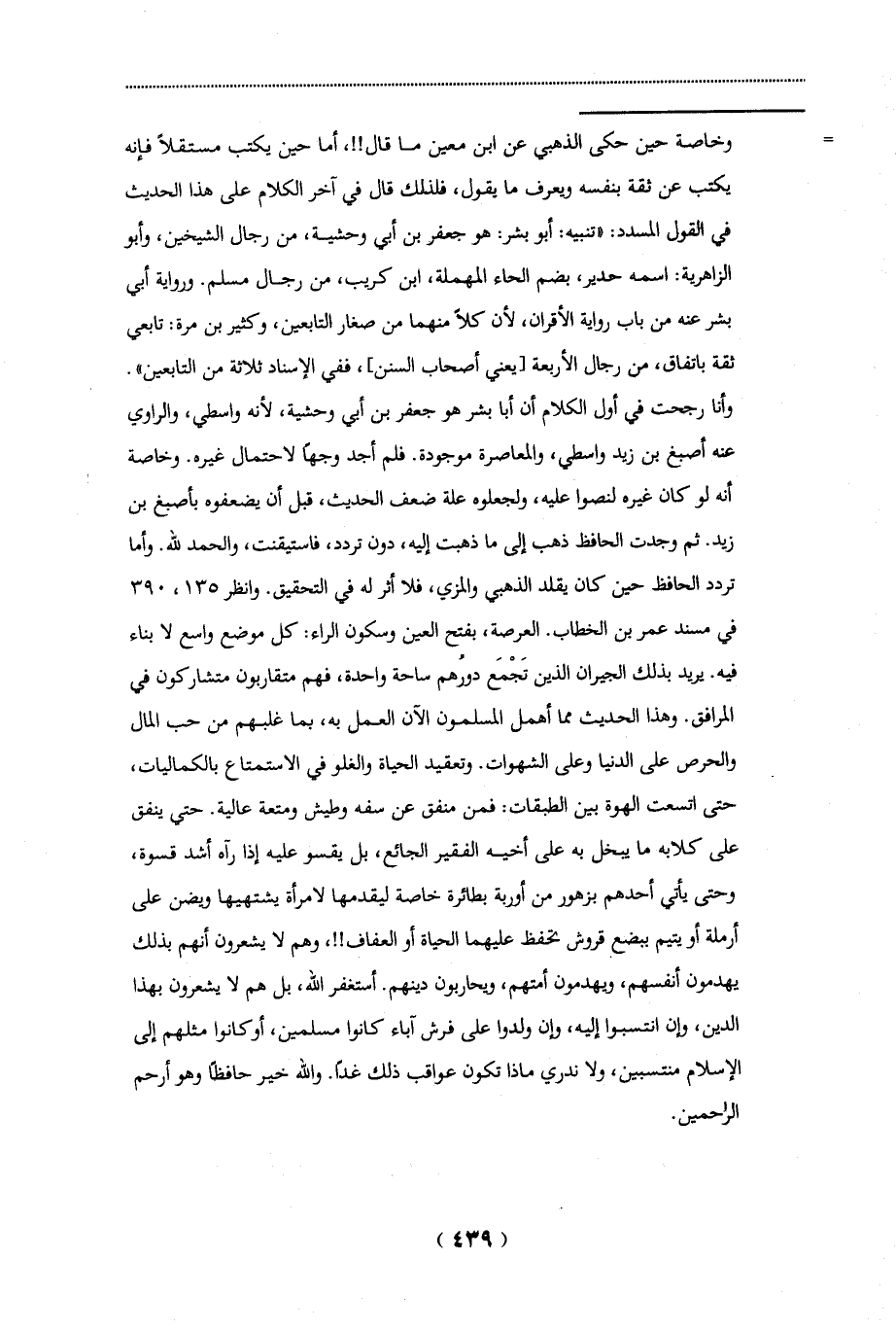 وأنا رجحت في أول الكلام أن أبا بشر هو جعفر بن أبي وحشية، لأنه واسطي، والراوي عنه أصبغ بن زيد واسطي، والمعاصرة موجودة. فلم أجد وجهاً لاحتمال غيره. وخاصة أنه لو كان غيره لنصوا عليه، ولجعلوه علة ضعف الحديث، قبل أن يضعفوه بأصبغ بن زيد. ثم وجدت الحافظ ذهب إلى ما ذهبت إليه، دون تردد، فاستيقنت، والحمد لله. وأما تردد الحافظ حين كان يقلد الذهبي والمزي، فلا أثر له في التحقيق. وانظر 135، 390 في مسند عمر بن الخطاب. العرصة، بفتح العين وسكون الراء: كل موضع واسع لا بناء فيه. يريد بذلك الجيران الذين تَجْمَع دورهم ساحة واحدة، فهم متقاربون متشاركون في المرافق. وهذا الحديث مما أهمل المسلمون الآن العمل به، بما غلبهم من حب المال والحرص على الدنيا وعلى الشهوات. وتعقيد الحياة والغلو في الاستمتاع بالكماليات، حتى اتسعت الهوة بين الطبقات: فمن منفق عن سفه وطيش ومتعة عالية. حتى ينفق على كلابه ما يبخل به على أخيه الفقير الجائع، بل يقسو عليه إذا رآه أشد قسوة، وحتى يأتي أحدهم بزهور من أوربة بطائرة خاصة ليقدمها لامرأة يشتهيها ويضن على أرملة أو يتيم ببضع قروش تحفظ عليهما الحياة أو العفاف!!، وهم لا يشعرون أنهم بذلك يهدمون أنفسهم، ويهدمون أمتهم، ويحاربون دينهم. أستغفر الله، بل هم لا يشعرون بهذا الدين، وإن انتسبوا إليه، وإن ولدوا على فرش آباء كانوا مسلمين، أوكانوا مثلهم إلى الإسلام منتسبين، ولا ندري ماذا تكون عواقب ذلك غداً". والله خير حافظاً وهو أرحم الراحمين.