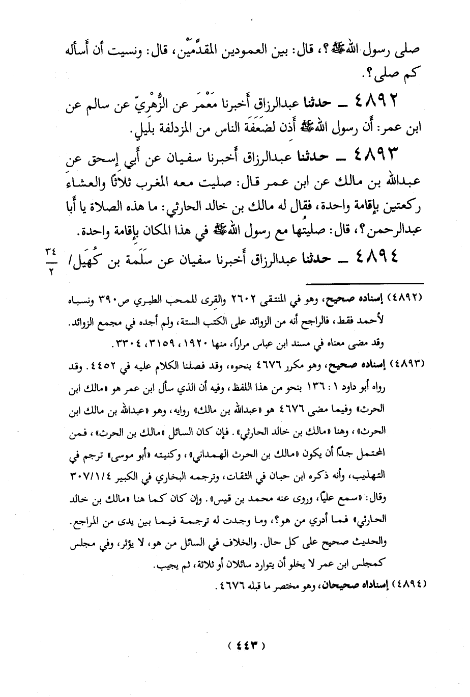 4893 - حدثنا عبد الرزاق أخبرنا سفيان عن أبي إِسحق عن عبد الله بن مالك عن ابن عمر قال: صليت معه المغرب ثلاثاً والعشاءَ ركعتين بإقامة واحدة، فقال له مالك بن خالد الحارثى: ما هذه الصلاة يا أَبا عبد الرحمن؟، قال: صليتُها مع رسول الله -صلي الله عليه وسلم - في هذا المكان بِإقامة واحدة.