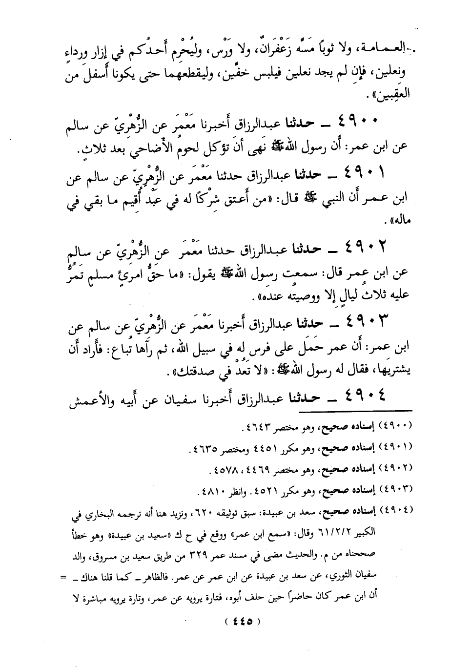 4900 - حدثنا عبد الرزاق أخبرنا مَعْمَر عن الزُّهْرِيّ عن سالم عن ابن عمر: أن رسول الله -صلي الله عليه وسلم - نَهى أنَ تؤكلِ لحومُ الأَضاحي بعد ثلاثٍ.