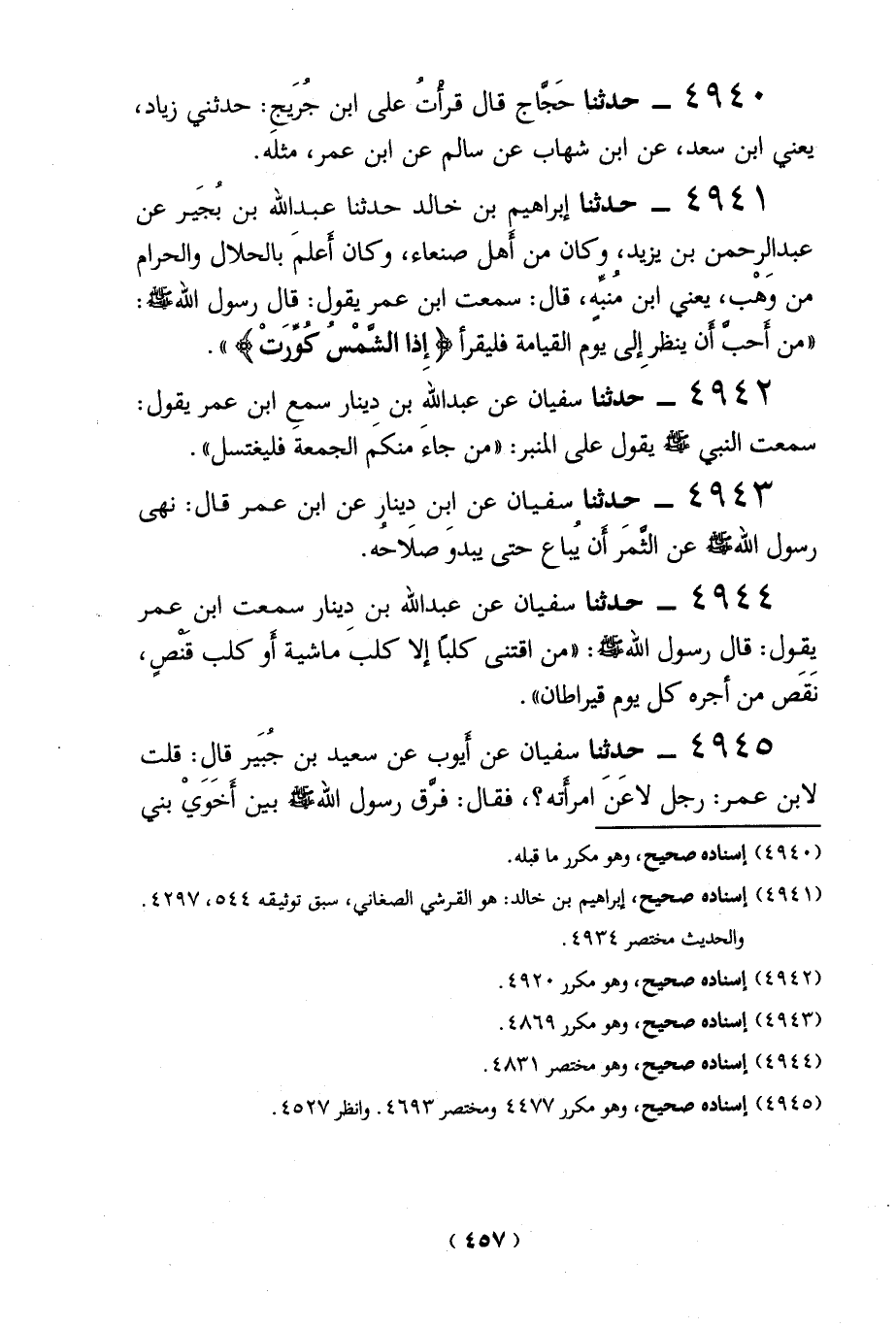 4941 - حدثنا إبراهيم بن خالد حدثنا عبد الله بن بُجَير عن عبد الِرحمن بن يزيد، وكان من أَهل صنعاء، وكان أَعلمَ بالحلال والحرام من وَهْب، يعني ابن مُنَّبهٍ، قال: سمعت ابن عمر يقول: قال رسول الله -صلي الله عليه وسلم -: "من أحبَّ أن ينظر إِلى يوم القيامة فليقرأ {إِذَا الشَّمْسُ كُوِّرَتْ (1)}.