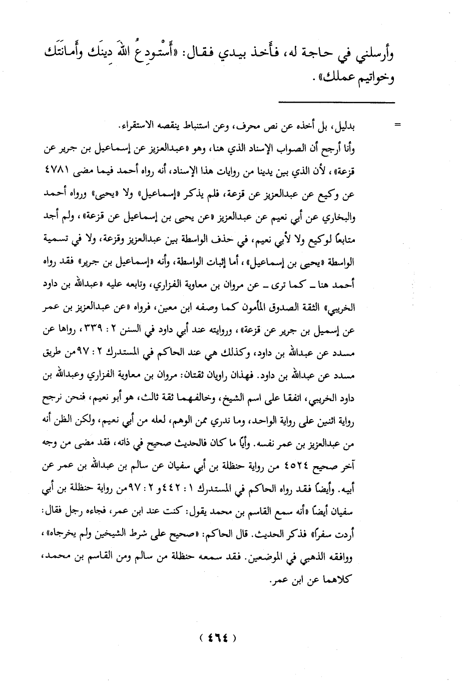 وأنا أرجح أن الصواب الإسناد الذي هنا، وهو " عبد العزيزعن إسماعيل بن جرير عن قزعة", لأن الذي بين يدينا من روايات هذا الإسناد، أنه رواه أحمد فيما مضى 4781 عن وكيع عن عبد العزيز عن قزعة، فلم يذكر "إسماعيل" ولا "يحيى" ورواه أحمد والبخاري عن أبي نعيم عن عبد العزيز "عن يحيى بن إسماعيل عن قزعة"، ولم أجد متابعاً لوكيع ولا لأبي نعيم، في حذف الواسطة بين عبد العزيز وقزعة، ولا في تسمية الواسطة" يحيى بن إسماعيل"، أما إثبات الواسطة، وأنه "إسماعيل بن جر" فقد رواه أحمد هنا- كما ترى- عن مروان بن معاوية الفزاري، وتابعه عليه "عبد الله بن داود الخريبي" الثقة الصدوق المأمون كما وصفه ابن معين، فرواه "عن عبد العزيز بن عمر عن إسميل بن جرير عن قزعة"، وروايته عند أبي داود في السنن 2: 339، رواها عن مسدد عن عبد الله بن داود، وكذلك هي عند الحاكم في المستدرك 2: 97 من طريق مسدد عن عبد الله بن داود. فهذان راويان ثقتان: مروان بن معاوية الفزاري وعبد الله بن داود الخريبي، اتفقا على اسم الشيخ، وخالفهما ثقة ثالث، هو أبو نعيم، فنحن نرجح رواية اثنين على رواية الواحد، وما ندري ممن الوهم، لعله من أبي نعيم، ولكن الظن أنه من عبد العزيز بن عمر نفسه. وأيَا ما كان فالحديث صحيح في ذاته، فقد مضى من وجه آخر صحيح 4524 من رواية حنظلة بن أبي سفيان عن سالم بن عبد الله بن عمر عن أبيه. وأيضما فقد رواه الحاكم في المستدرك 1: 442 و 2: 97 من رواية حنظلة بن أبي سفيان أيضَا أنه سمع القاسم بن محمد يقول: كنت عند ابن عمر، فجاءه رجل فقال: أردت سفر، "فذكر الحديث. قال الحاكم: "صحيح على شرط الشيخين ولم يخرجاه"، ووافقه الذهبي في الموضعين. فقد سمعه حنظلة من سالم ومن القاسم بن محمد، كلاهما عن ابن عمر.
