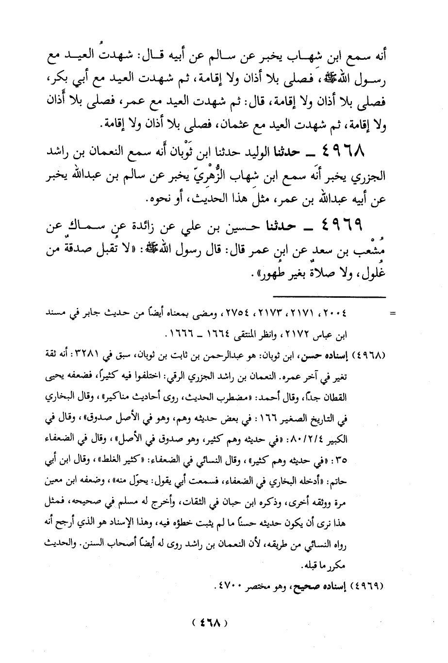 (4968) إسناده حسن، ابن ثوبان: هو عبد الرحمن بن ثابت بن ثوبان، سبق في 3281: أنه ثقة تغير في آخر عمره. النعمان بن راشد الجزري الرقي: اختلفوا فيه كثيراً، فضعفه يحيى القطان جداً، وقال أحمد: "مضطرب الحديث، روى أحاديث مناكير"، وقال البخاري في التاريخ الصغير 166: في بعض حديثه وهم، وهو في الأصل صدوق"، وقال في الكبير 2/ 4/ 80: (في حديثه وهم كثير، وهو صدوق في الأيلي، وقال في الضعفاء 35: "في حديثه وهم كثير"، وقال النسائي في الضعفاء: "كثير الغلط"، وقال ابن أبي حاتم: "أدخله البخاري في الضعفاء، فسمعت أبي يقول: يحول منه"، وضعفه ابن معين مرة ووثقه أخرى، وذكره ابن حبان في الثقات، وأخرج له مسلم في صحيحه، فمثل هذا نرى أن يكون حديثه حسنا ما لم يثبت خطؤه فيه، وهذا الإسناد هو الذي أرجح أنه رواه النسائي من طريقه؛ لأن النعمان بن راشد روى له أيضاً أصحاب السنن. والحديث مكرر ما قبله.