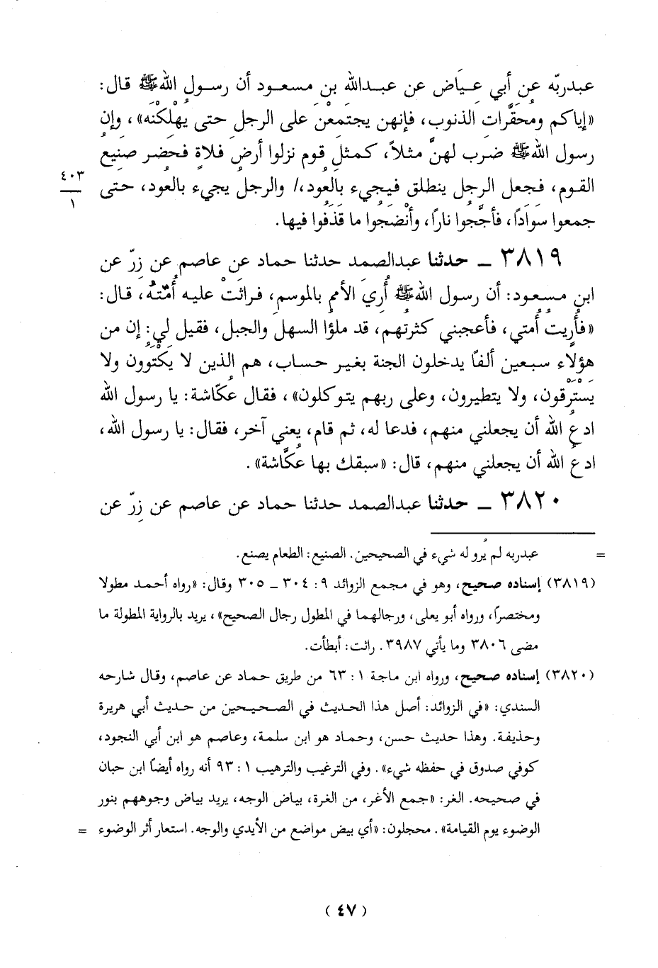 3819 - حدثنا عبد الصمد حدثنا حماد عن عاصم عن زِرّ عن ابن مسعود: أن رسول الله - صلى الله عليه وسلم - أُرِيَ الأمم بالموسمِ، فراثَتْ عليه أُمتُه، قال: "فأُريتُ أُمتي، فأعجبني كثرتُهم، قد ملؤا السهل والجبل، فقيل لي: إن من هِؤلاء سبعين ألفاً يدخلون الجنة بغير حساب، هم الذين لا يَكْتَوُون ولا يَسْتَرْقون، ولا يتطيرون، وعلى ربهم يتوكلون"، فقال عُكّاشة: يا رسول الله ادعُ الله أن يجعلني منهم، فدعا له، ثم قام، يعني آخر، فقال: يا رسول الله، ادعُ الله أن يجعلني منهم، قال: "سبقك بها عُكَّاشة".