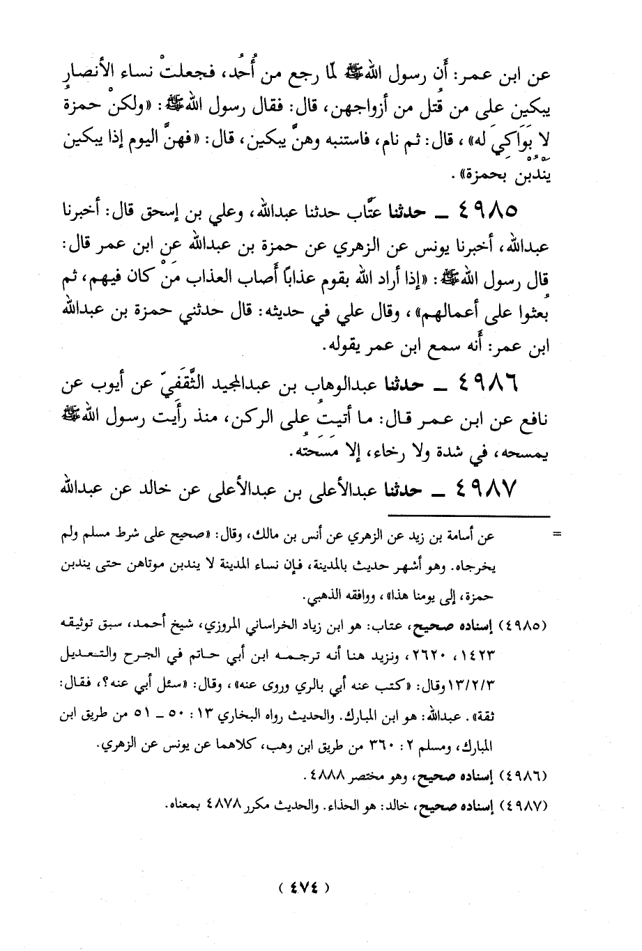= عن أسامة بن زيد عن الزهري عن أنس بن مالك، وقال: "صحيح على شرط مسلم ولم يخرجاه. وهو أشهر حديث بالمدينة، فإن نساء المدينة لا يندبن موتاهن حتى يندبن حمزة، إلى يومنا هذا"، ووافقه الذهبي.