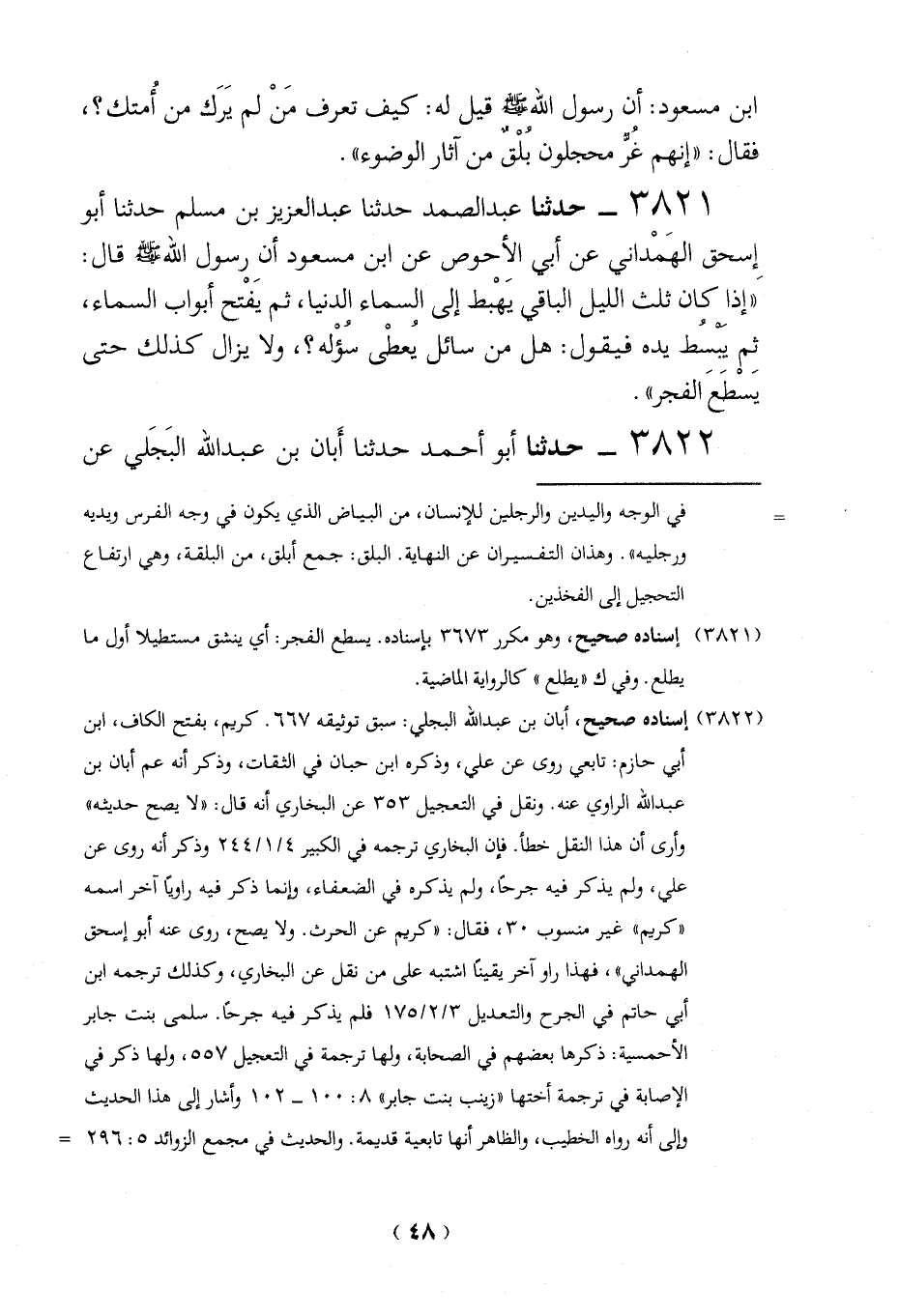 3821 - حدثنا عبد الصمد حدثنا عبد العزيز بن مسلم حدثنا أبو إِسحق الهَمْداني عن أبي الأحوص عن ابن مسعود أن رسول الله - صلى الله عليه وسلم - قال: "إذا كان ثلت الليل الباقي يَهْبط إلى السماء الدنيا، ثم يَفْتح أبواب السماء، ثم يَبْسُط يده فيقول: هل من سائل يُعطْى سُؤْله؟، ولا يزال كذلك حتى يَسْطَعَ الفجر".