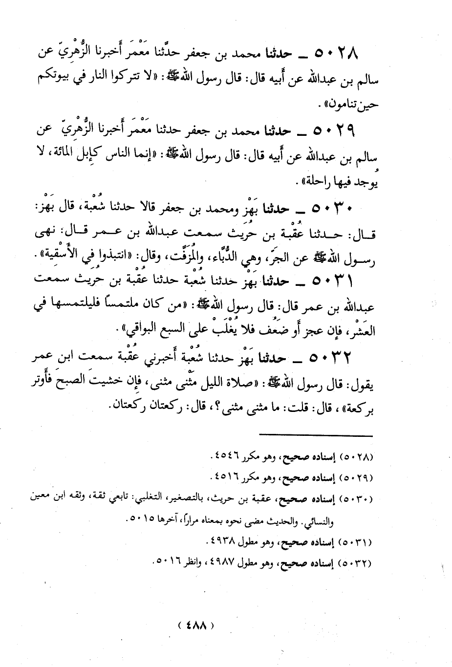 5032 - حدثنا بَهْز حدثنا شُعْبة أَخبرني عقبة سمعت ابن عمر يقول: قال رسول الله -صلي الله عليه وسلم -: "صلاة الليل مثنى مثنى، فِإن خشيتَ الصبحَ فأَوتر بركعة"، قال: قلت: ما مثنى مثنى؟، قال: ركعتان ركعتان.