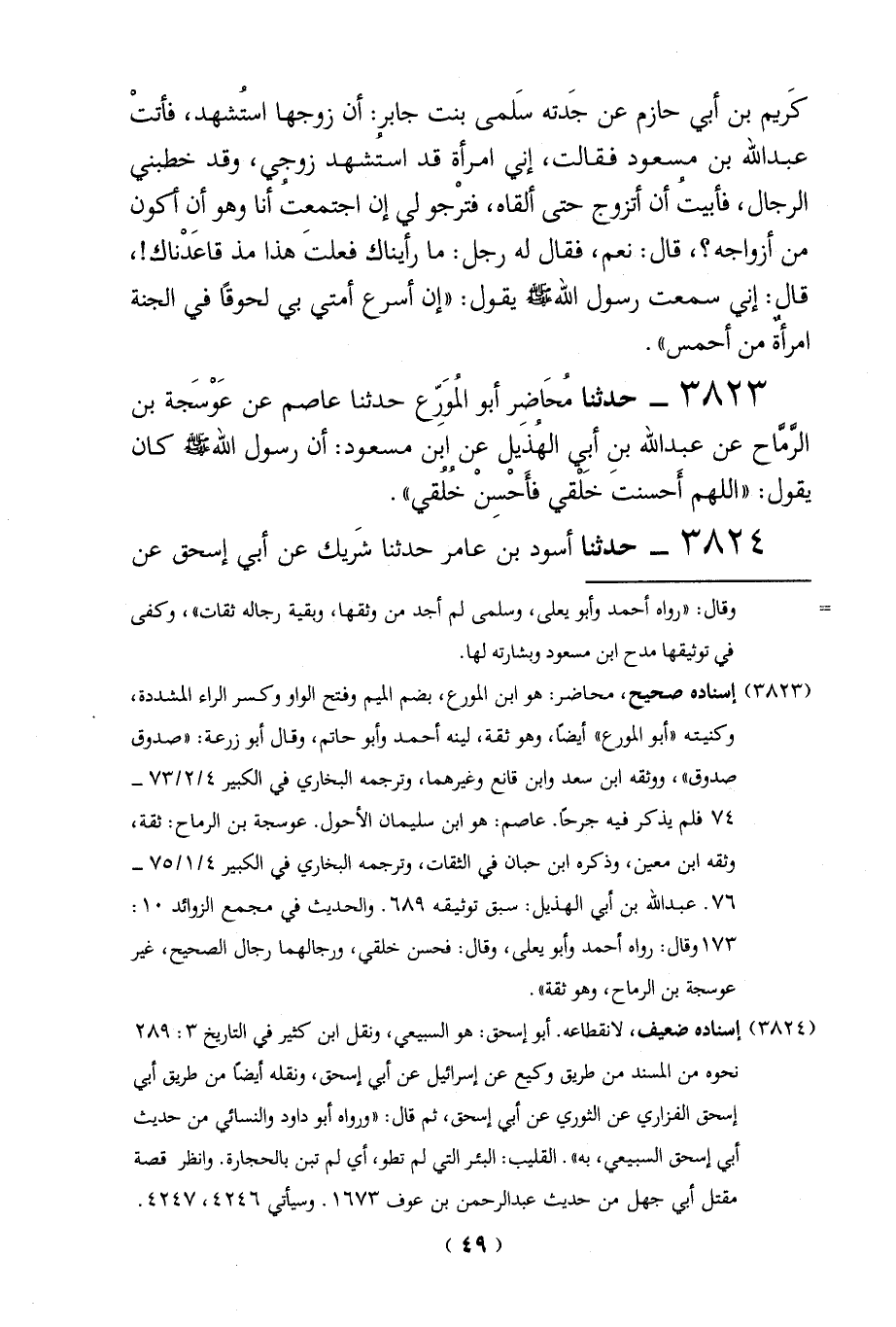 3823 - حدثنا مُحَاضر أبو المُوَرِّع حدثنا عاصم عن عَوْسَجة بن الرَّمَّاح عن عبد الله بن أبِي الهُذَيل عن ابن مسعود: أن رسول الله - صلى الله عليه وسلم - كان يقول: "اللهم أَحسنتَ خلْقي فأَحْسِنْ خُلُقي".