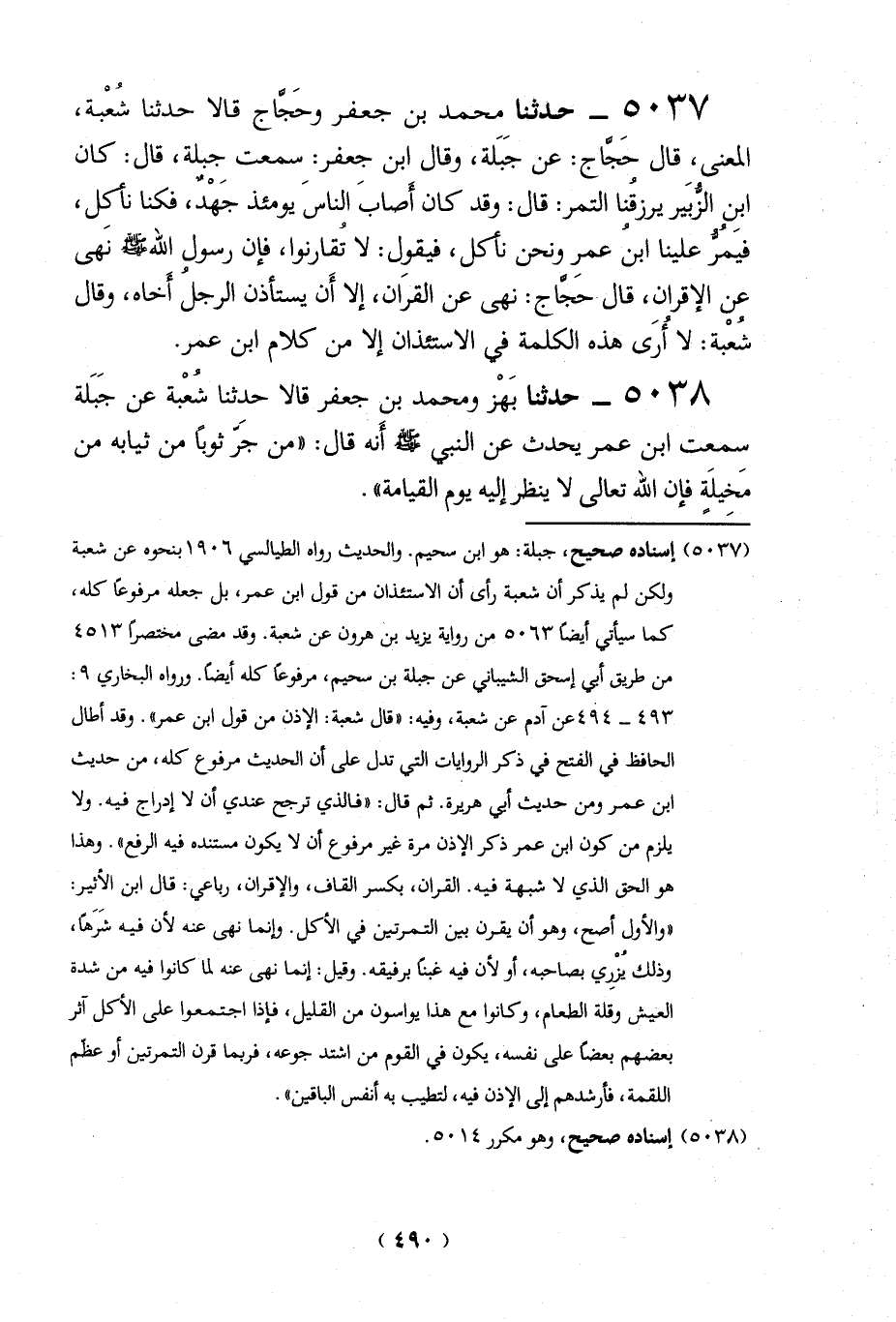 5037 - حدثنا محمد بن جعفر وحَحَّاج قالا حدثنا شُعْبة، المعنى، قال حَحَّاج: عن جَبَلة، وقال ابن جعفر: سِمعت جبلة، قال: كان ابن الزُّبَير يرزقُنا التمر: قال: وقد كان أَصابَ الناس يومئذ جهْدٌ، فكنا نأكل، فيمرُّ علينا ابن عمر ونحن نأكل، فيقول: لا تُقارنوا، فإن رسول الله -صلي الله عليه وسلم - نهى عن الإقران، قال حَحَّاج: نهى عن القرَان، إلا أَن يستأذن الرجل أخاه، وقال شُعبة: لا أرَى هذه الكلمة في الاستئذان إلا من كلام ابن عمر.